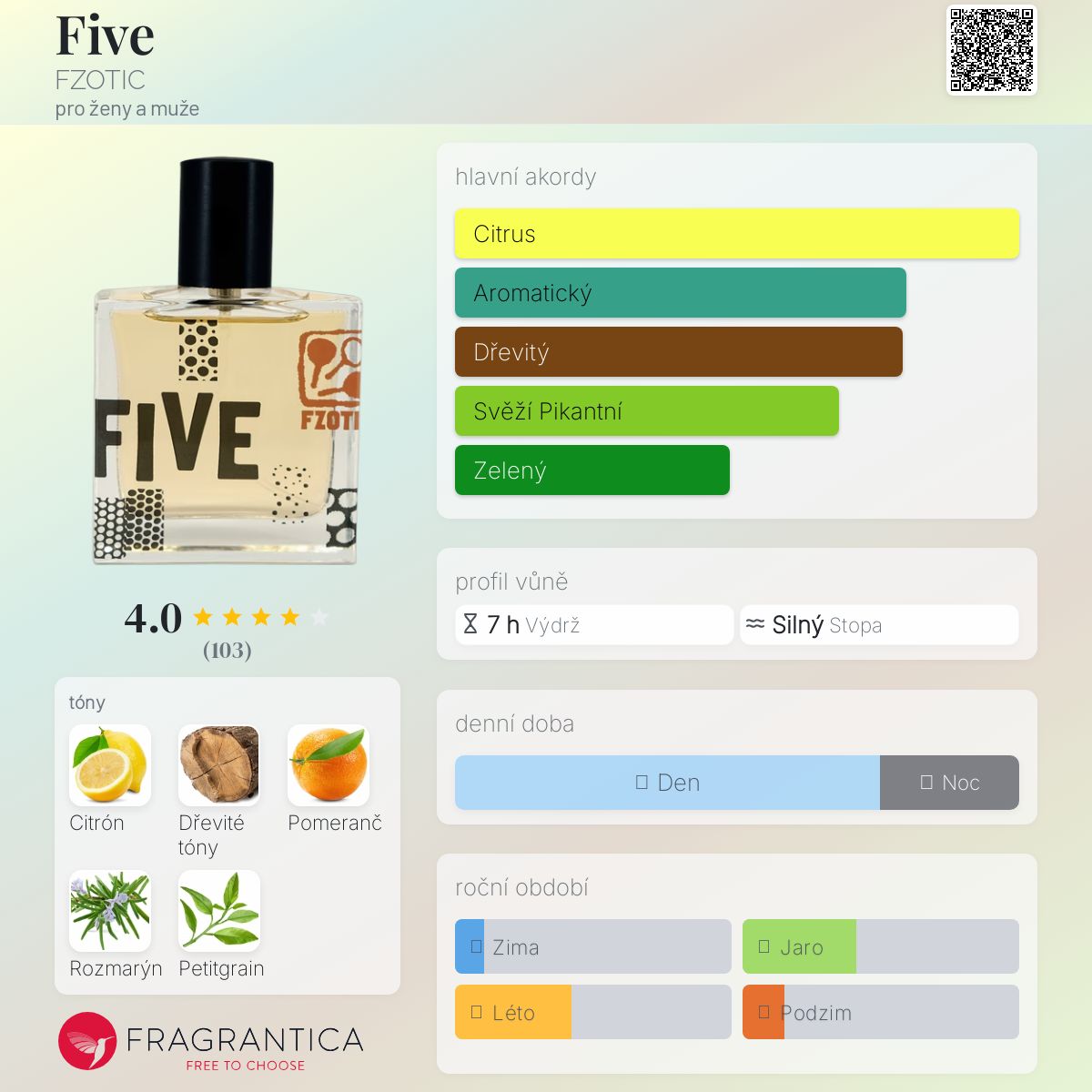 Five podle FZOTIC je Citrus Aromatic vůně pro ženy a muže. Five byl/a uveden/a v roce 2013. "Nosem" za touto vůní je Bruno Fazzolari. Vrchní tóny jsou Citrón a Sladký pomeranč; střední tóny jsouRozmarýn a Petitgrain ; základní tón je Dřevité tóny.