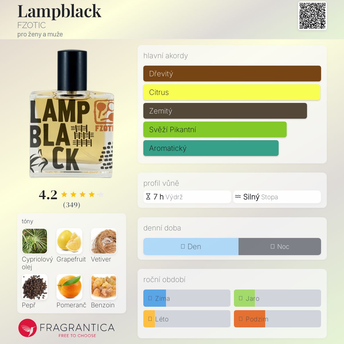 Lampblack podle FZOTIC je Aromatic Spicy vůně pro ženy a muže. Lampblack byl/a uveden/a v roce 2013. "Nosem" za touto vůní je Bruno Fazzolari. Vrchní tóny jsou Černý pepř a Sladký pomeranč; střední tón jeGrapefruit ; základní tóny jsou Cypriolový olej, Vetiver a Benzoin.