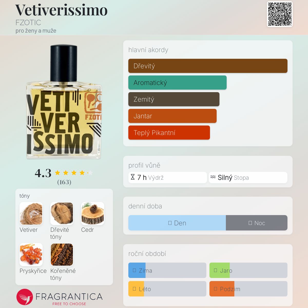 Vetiverissimo podle FZOTIC je Aromatic Spicy vůně pro ženy a muže. Vetiverissimo byl/a uveden/a v roce 2018. "Nosem" za touto vůní je Bruno Fazzolari.