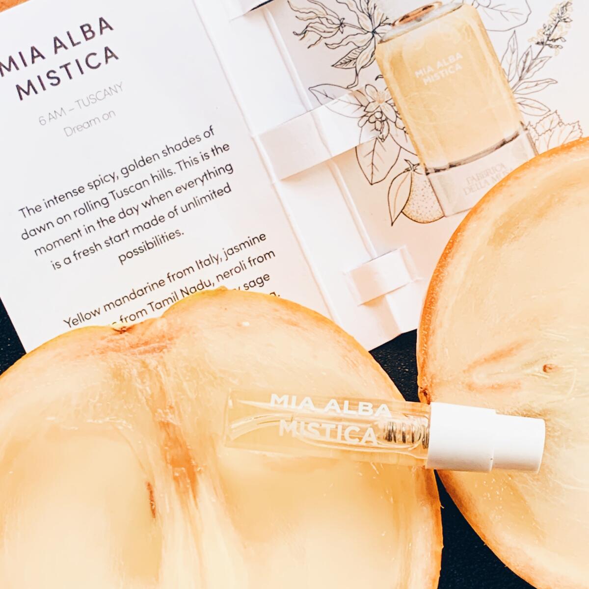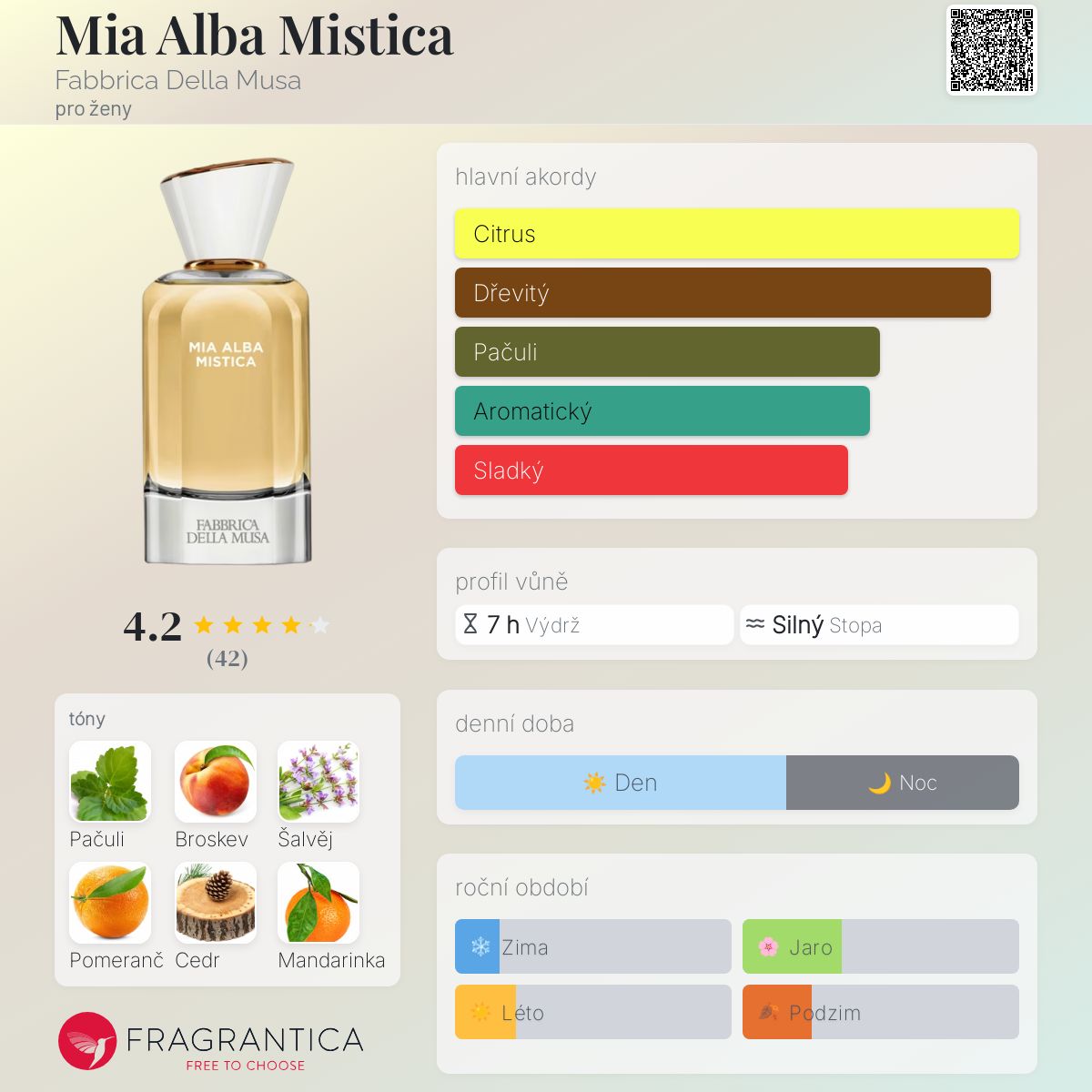 Mia Alba Mistica podle Fabbrica Della Musa je Citrus Aromatic vůně pro ženy. Mia Alba Mistica byl/a uveden/a v roce 2022. "Nosem" za touto vůní je Hamid Merati-Kashani. Vrchní tóny jsou Bílá broskev, Pomerančový olej a Žlutá mandarinka; střední tóny jsouŠalvěj, Jasmín, Neroli, Madagarská kananga a Levandule ; základní tóny jsou Pačuli, Cedr a Muškátový oříšek.