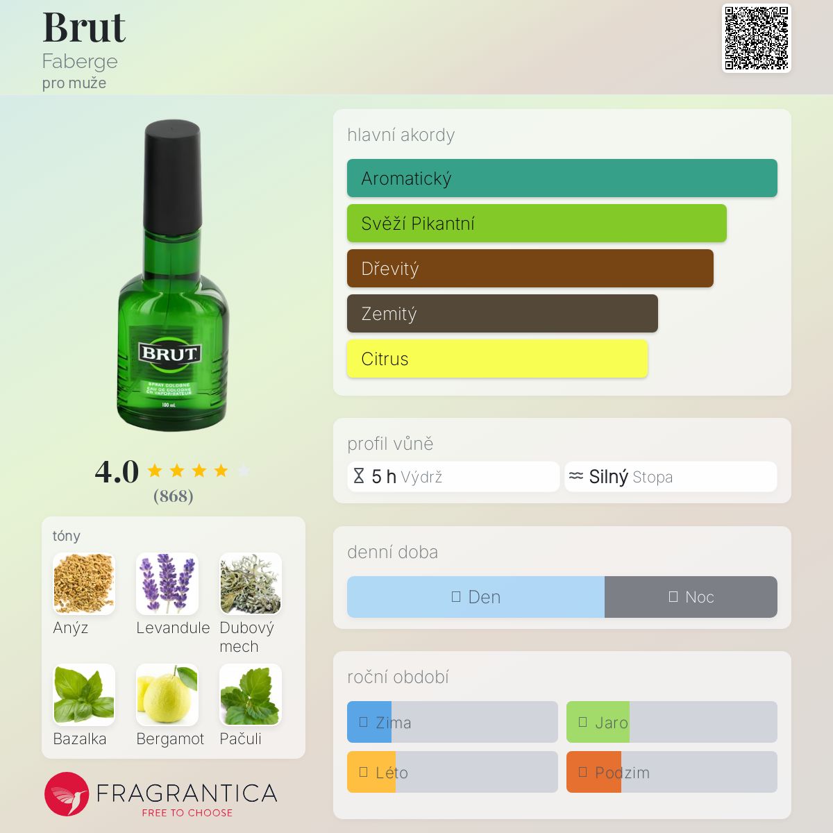 Brut podle Faberge je Aromatic Spicy vůně pro muže. Brut byl/a uveden/a v roce 1968. "Nosem" za touto vůní je Karl Mann. Vrchní tóny jsou Anýz, Levandule, Bazalka, Bergamot a Citrón; střední tóny jsouPelargónie, Jasmín a Ylang-Ylang ; základní tóny jsou Dubový mech, Pačuli, Vetiver, Fazole tonka, Vanilka a Santalové dřevo.