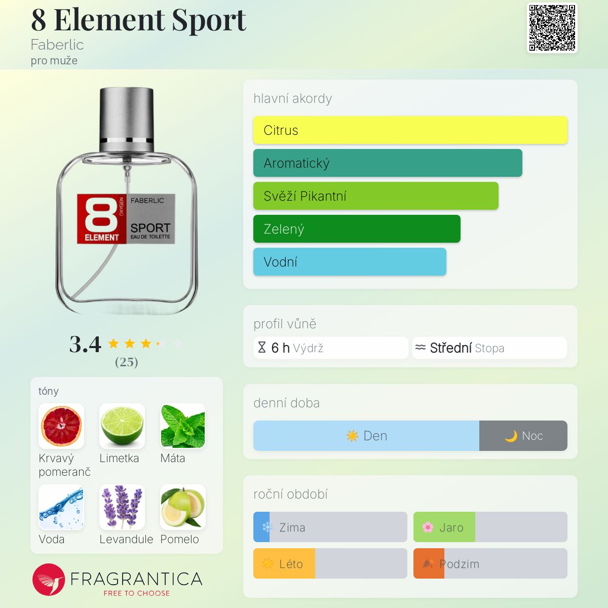 8 Element Sport podle Faberlic je vůně pro muže. 8 Element Sport byl/a uveden/a v roce 2016. "Nosem" za touto vůní je Bertrand Duchaufour. Vrchní tóny jsou Krvavý pomeranč, Limetka, Máta peprná, Levandule, Pomelo, Kardamom a Šalvěj muškátová; střední tóny jsouVodní tóny a Pelargónie ; základní tóny jsou Dřevité tóny, Pižmo, Dubový mech, Bílé dřevo a Ambra.