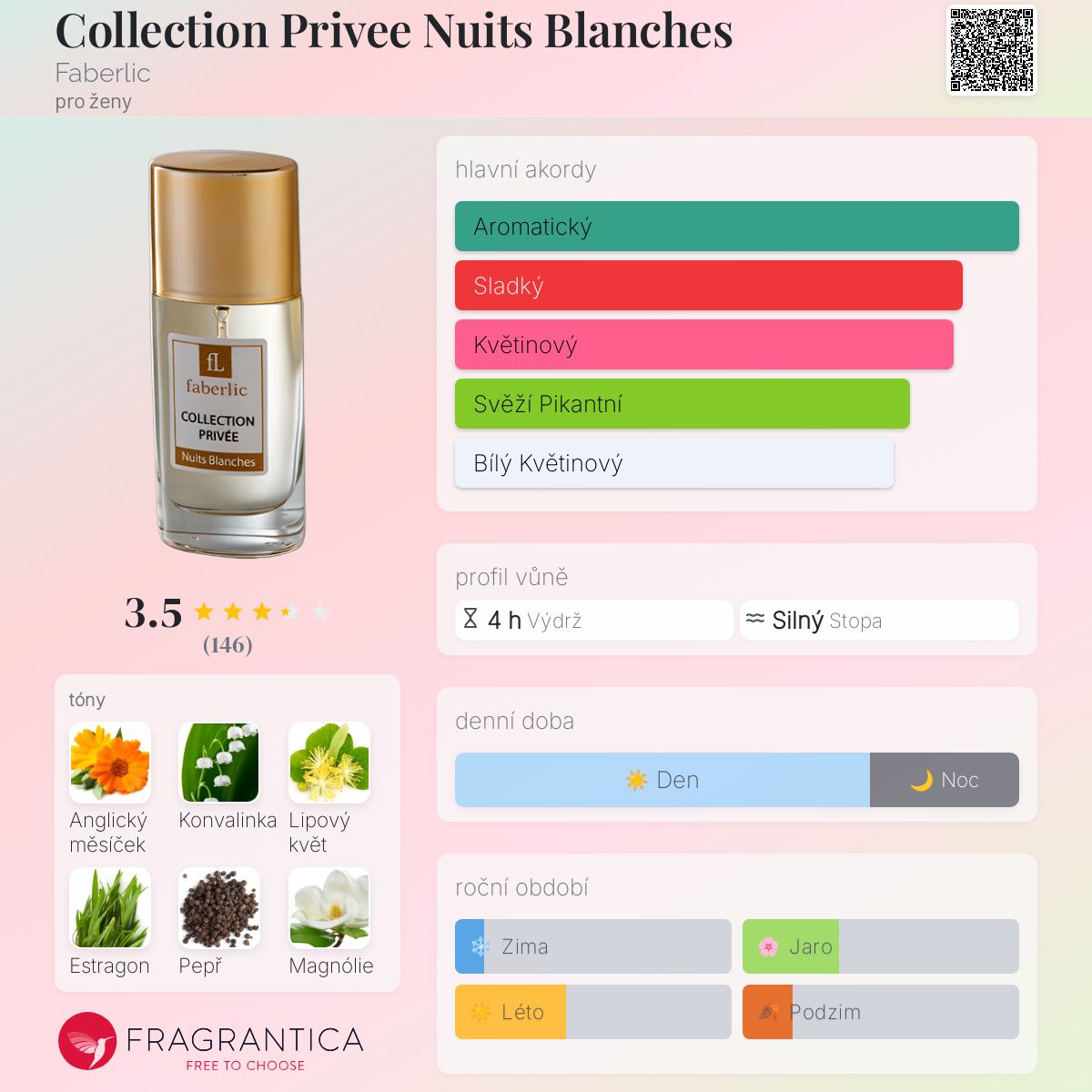 Collection Privee Nuits Blanches podle Faberlic je Floral vůně pro ženy. Collection Privee Nuits Blanches byl/a uveden/a v roce 2010. "Nosem" za touto vůní je Ilias Ermenidis. Vrchní tóny jsou Lipový květ, Estragon, Pepř a Mandarinka; střední tóny jsouMěsíček, Konvalinka, Magnólie a Zázvor ; základní tóny jsou Mučenka, Santalové dřevo, Vetiver, Jantar (ambra) a Kadidlo.