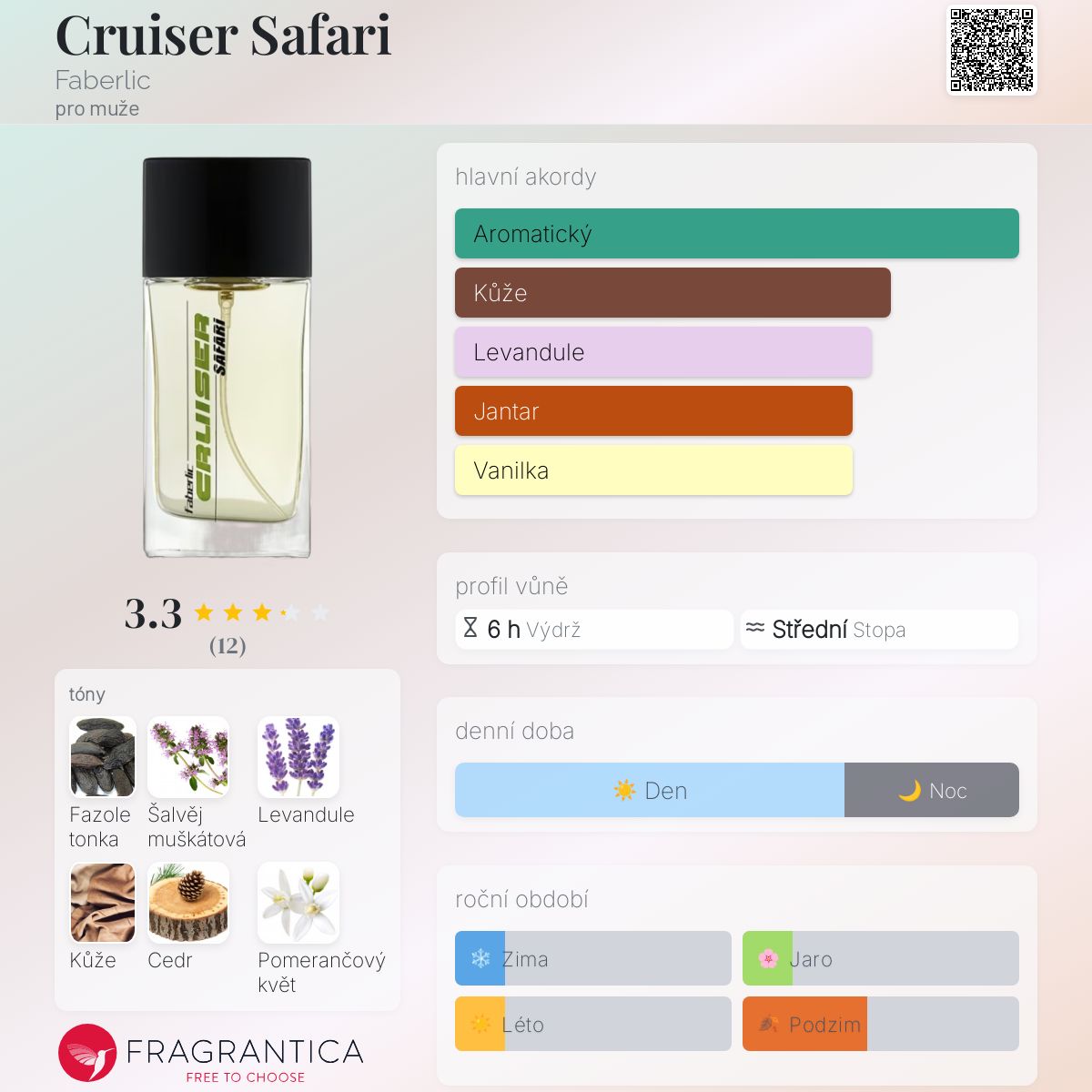 Cruiser Safari podle Faberlic je Orientální Fougere vůně pro muže. Cruiser Safari byl/a uveden/a v roce 2018. Vrchní tóny jsou Šalvěj muškátová, Mandarinka a Zázvor; střední tóny jsouLevandule, Pomerančový květ a Kadidlo ; základní tóny jsou Fazole tonka, Kůže a Cedr.