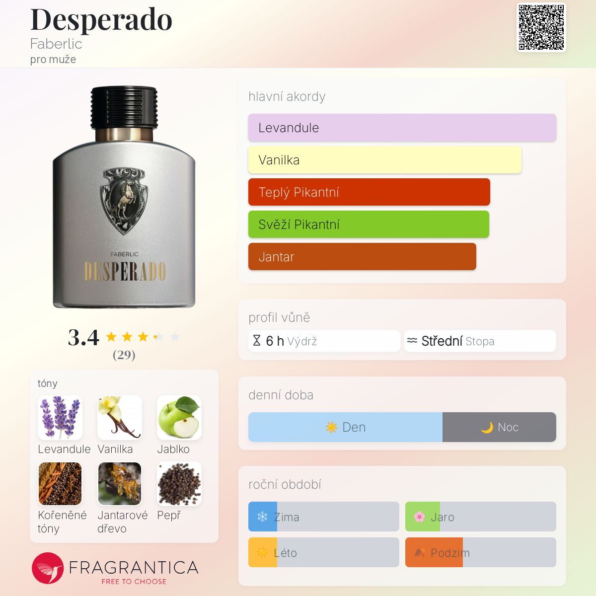 Desperado podle Faberlic je Aromatic Fougere vůně pro muže. Desperado byl/a uveden/a v roce 2020. "Nosem" za touto vůní je Fanny Bal. Vrchní tóny jsou Grapefruit a Bergamot; střední tóny jsouLevandule, Jablko, Kořeněné tóny, Černý pepř a Ozonové tóny ; základní tóny jsou Levandule, Vanilka a Jantarové dřevo.