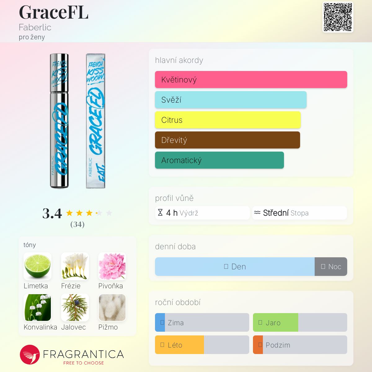 GraceFL podle Faberlic je Floral vůně pro ženy. GraceFL byl/a uveden/a v roce 2019. "Nosem" za touto vůní je Jean Jacques. Vrchní tón je Limetka ; střední tóny jsouFrézie, Pivoňka, Konvalinka a Jalovec ; základní tóny jsou Pižmo, Cedr a Jantar (ambra).