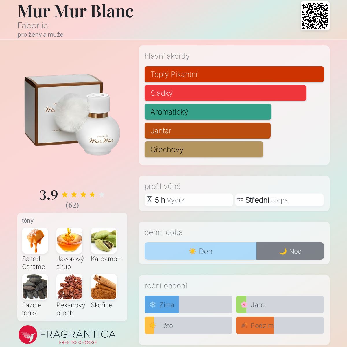 Mur Mur Blanc podle Faberlic je Orientální Woody vůně pro ženy a muže. Toto je nová vůně. Mur Mur Blanc byl/a uveden/a v roce 2025. Vrchní tóny jsou Slaný karamel, Kardamom a Bergamot; střední tóny jsouJavorový sirup, Pekanový ořech, Skořice a Muškátový květ ; základní tóny jsou Fazole tonka, Jantar (ambra) a Guajakové dřevo.