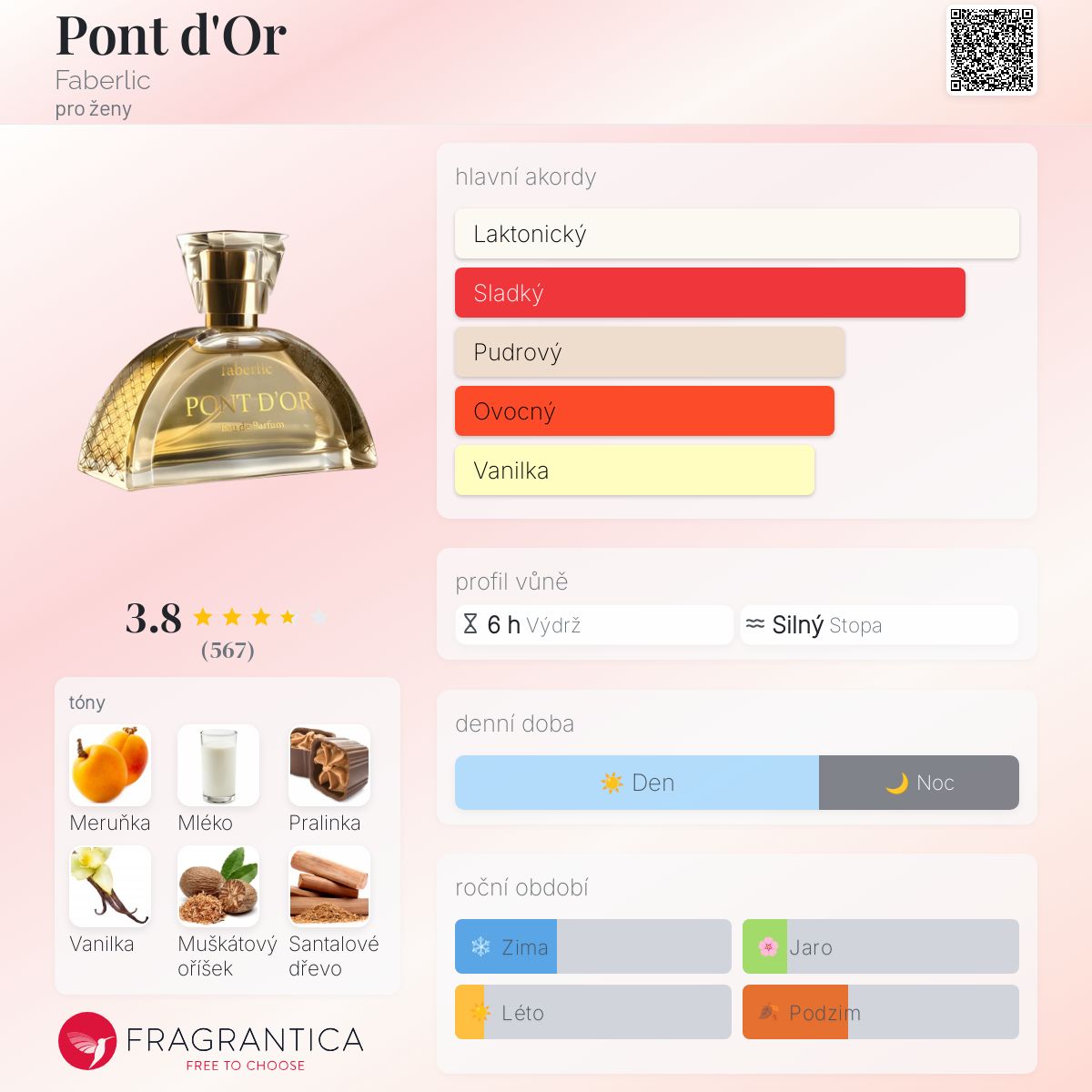 Pont d'Or podle Faberlic je Floral Fruity Gourmand vůně pro ženy. Pont d'Or byl/a uveden/a v roce 2014. "Nosem" za touto vůní je Bertrand Duchaufour. Vrchní tóny jsou Pomelo, Bergamot a Grapefruit; střední tóny jsouMeruňka, Pralinka, Muškátový oříšek, Jasmín a Pivoňka ; základní tóny jsou Mléko, Vanilka, Santalové dřevo, Jantar (ambra) a Bílé pižmo.