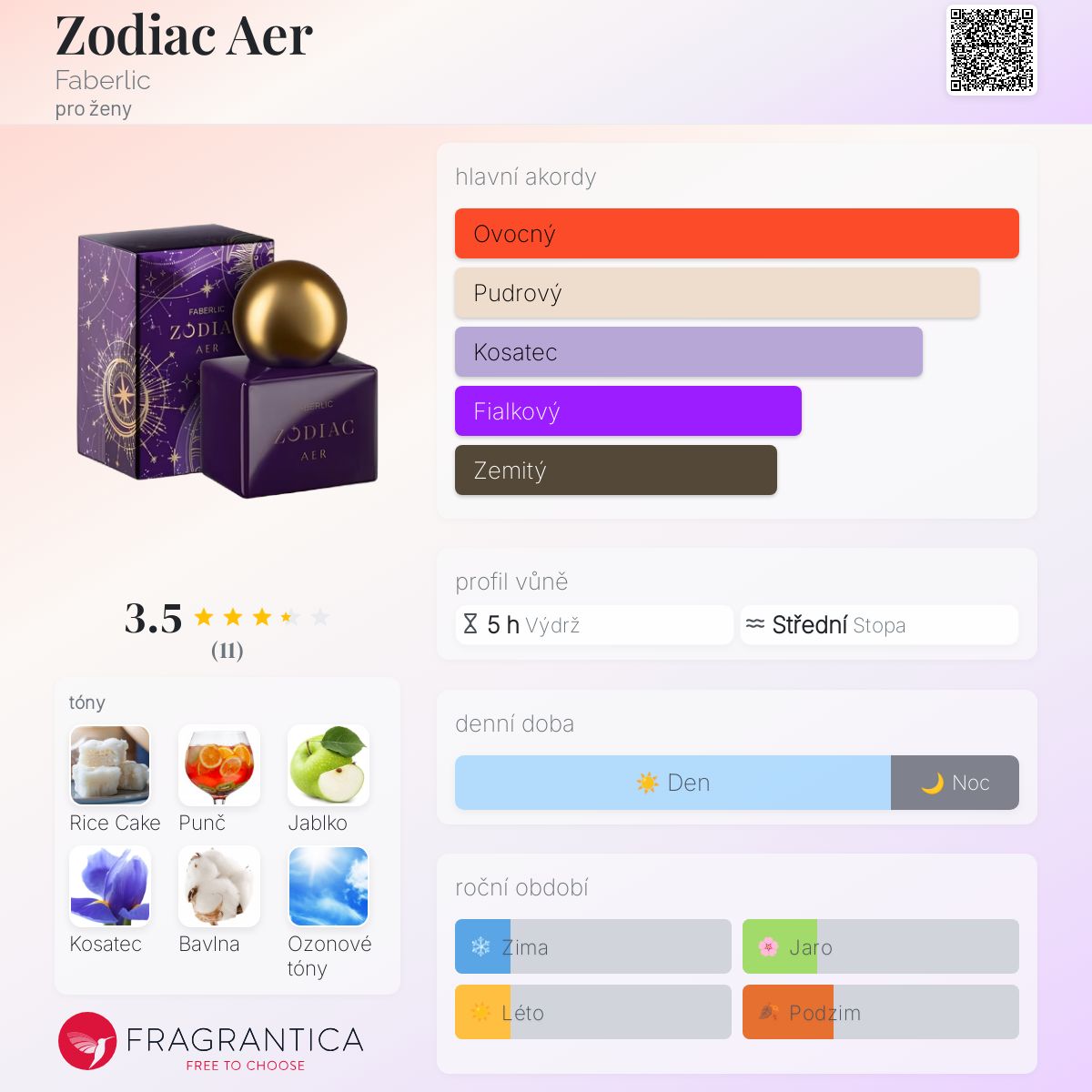 Zodiac Aer podle Faberlic je Floral Fruity vůně pro ženy. Toto je nová vůně. Zodiac Aer byl/a uveden/a v roce 2025. Vrchní tóny jsou Ozonové tóny, Minerální tóny, Punč a Jablko; střední tóny jsouKosatec, Bavlna, Konvalinka a Pivoňka ; základní tóny jsou Rýžový koláček, Květ hedvábného stromu a Pižmo.