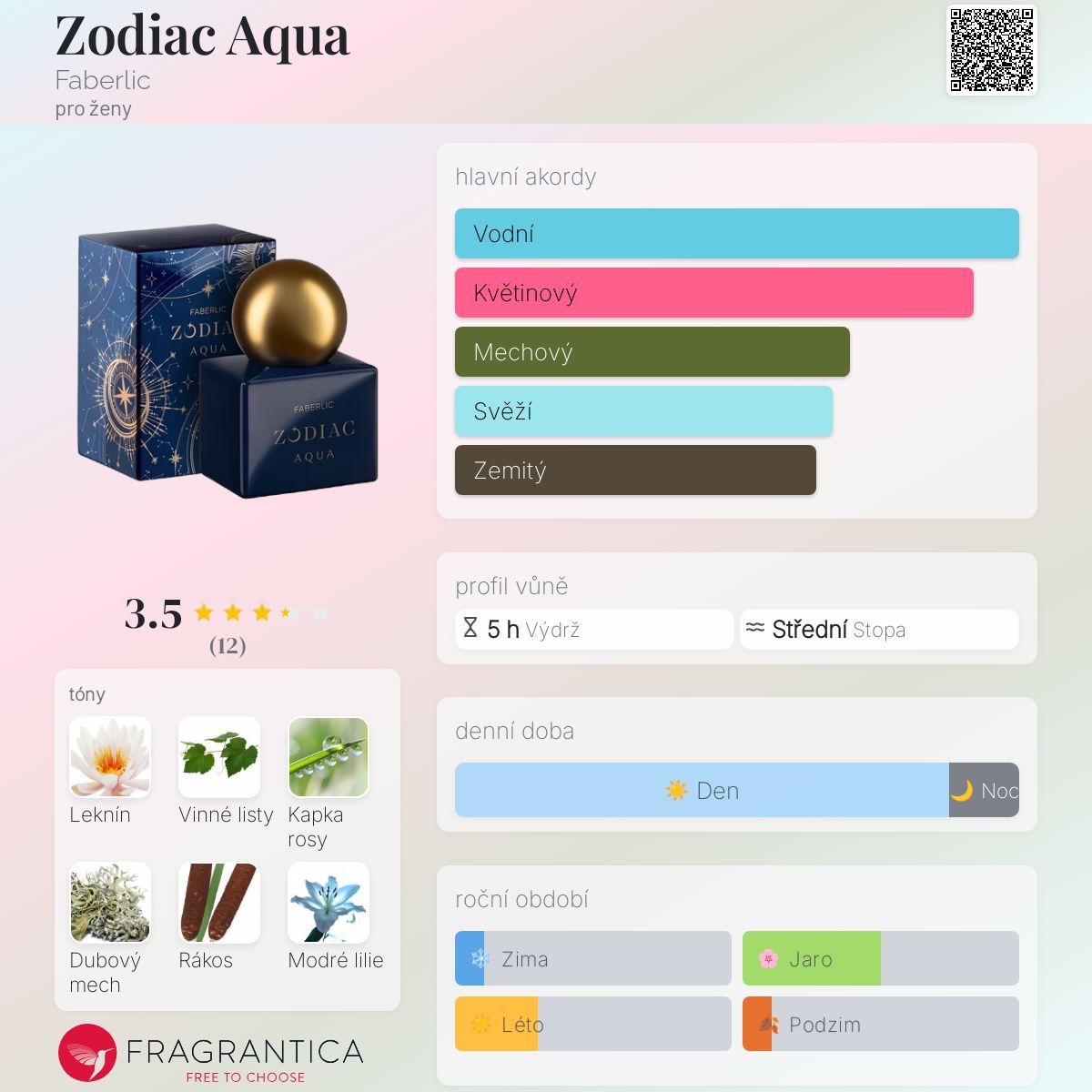 Zodiac Aqua podle Faberlic je Floral Aquatic vůně pro ženy. Toto je nová vůně. Zodiac Aqua byl/a uveden/a v roce 2025. Vrchní tóny jsou Leknín, Kapka rosy a Rákos; střední tóny jsouModré lilie, Trnovník akát a Zvonek ; základní tóny jsou Vinné listy, Mech, Pižmo a Kapradina.