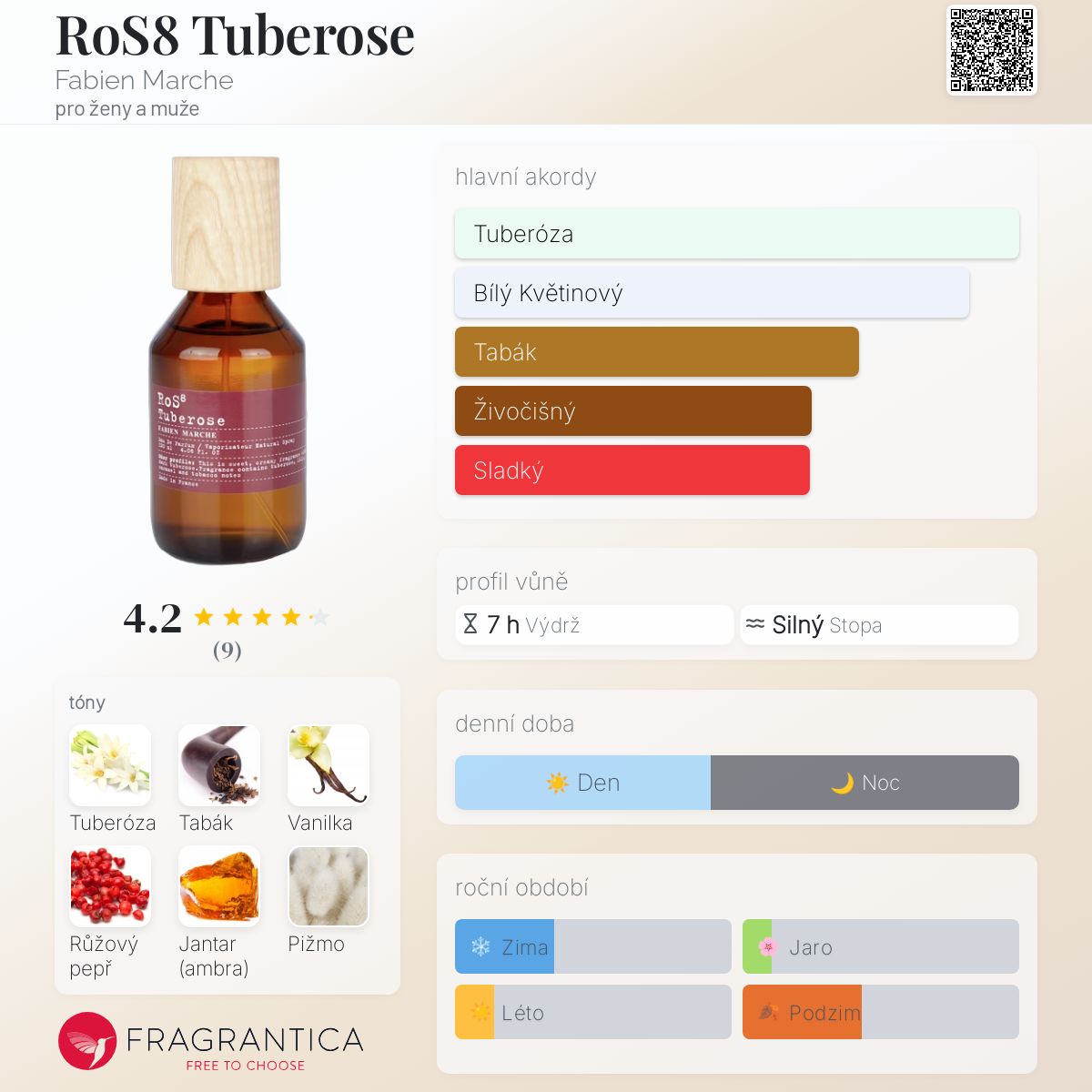 RoS8 Tuberose podle Fabien Marche je Orientální Floral vůně pro ženy a muže. RoS8 Tuberose byl/a uveden/a v roce 2023. Vrchní tóny jsou Růžový pepř a Pomeranč; střední tóny jsouTuberóza, Lilie a Orchidej ; základní tóny jsou Tabák, Vanilka, Jantar (ambra), Pižmo a Pačuli.