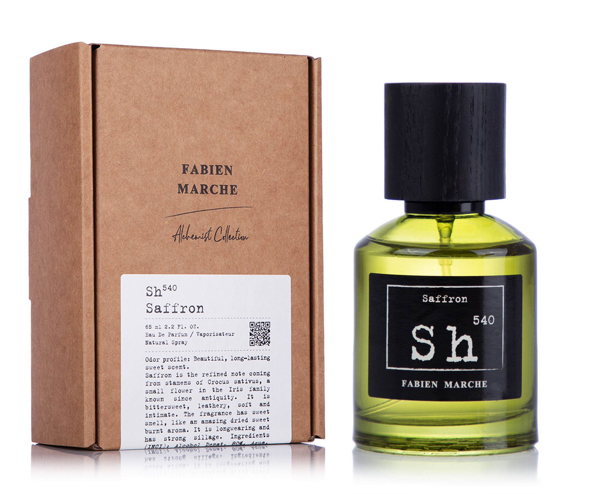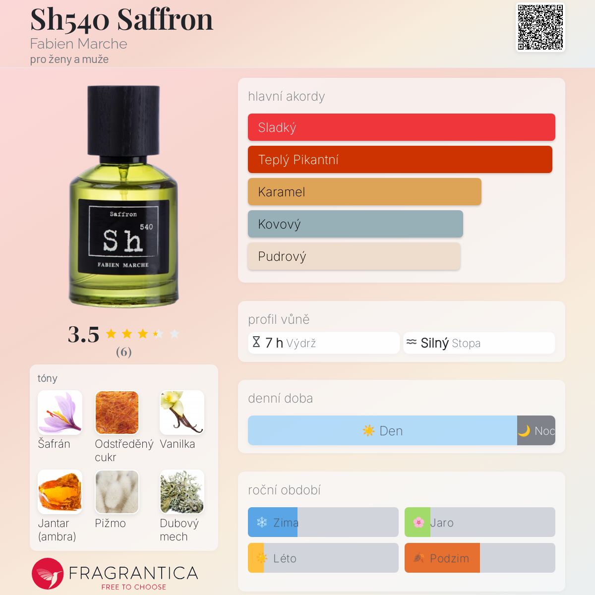 Sh540 Saffron podle Fabien Marche je Orientální Floral vůně pro ženy a muže. Sh540 Saffron byl/a uveden/a v roce 2022. "Nosem" za touto vůní je Famille Grasse Parfums. Vrchní tón je Šafrán ; střední tón jeOdstředěný cukr ; základní tóny jsou Vanilka, Jantar (ambra), Pižmo, Dubový mech a Santalové dřevo.