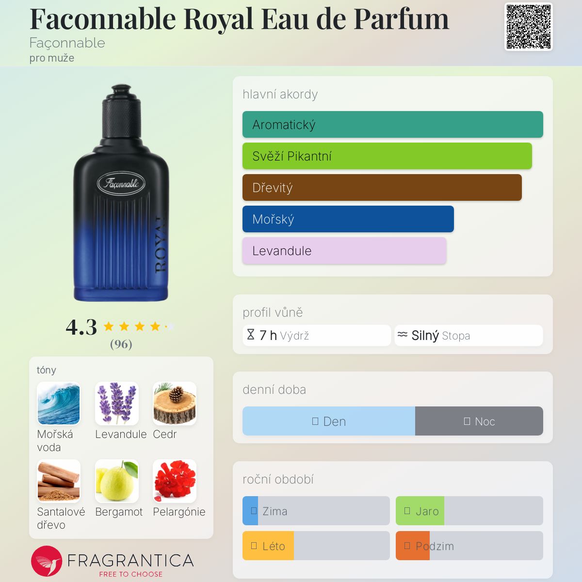 Faconnable Royal Eau de Parfum podle Façonnable je Woody Aromatic vůně pro muže. Faconnable Royal Eau de Parfum byl/a uveden/a v roce 2018. "Nosem" za touto vůní je Karine Dubreuil-Sereni. Vrchní tóny jsou Levandule a Bergamot; střední tóny jsouMořská voda, Pelargónie a Muškátový oříšek ; základní tóny jsou Cedr, Santalové dřevo, Mech a Fazole tonka.