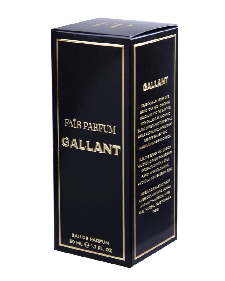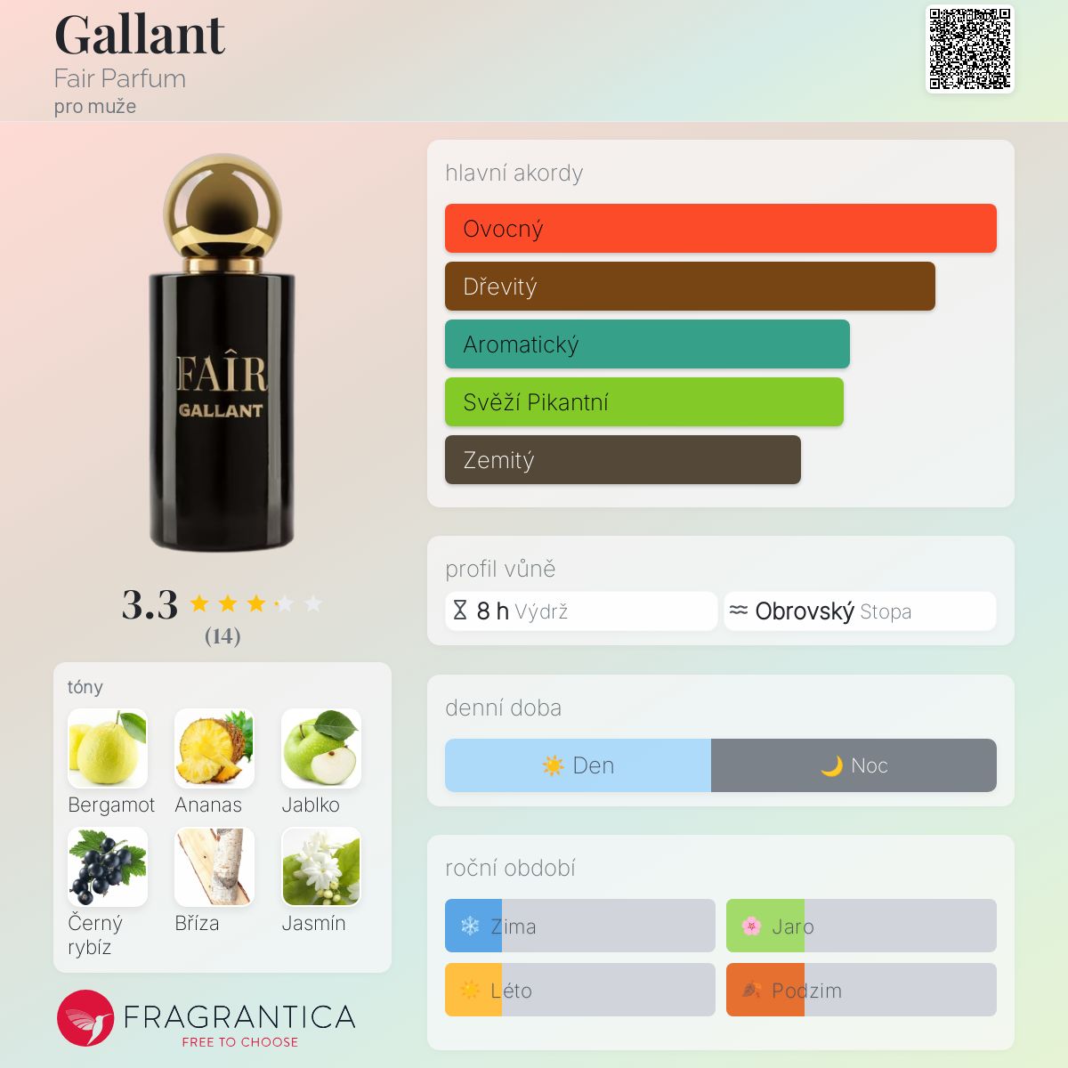 Gallant podle Fair Parfum je vůně pro muže. Gallant byl/a uveden/a v roce 2020. Vrchní tóny jsou Bergamot, Ananas, Jablko a Černý rybíz; střední tóny jsouBříza, Jasmín, Pačuli, Jalovcové bobulky a Růže ; základní tóny jsou Ambra, Dubový mech, Vanilka a Pižmo.