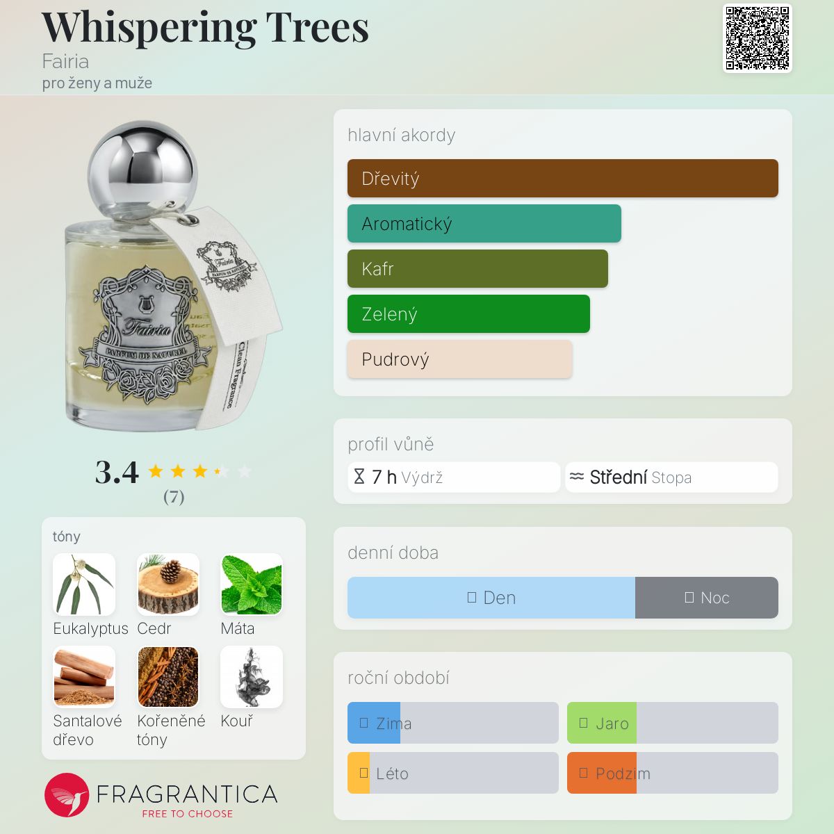 Whispering Trees podle Fairia je vůně pro ženy a muže. Vrchní tóny jsou Eukalyptus a Pikantní máta; střední tóny jsouKoření a Kouř ; základní tóny jsou Cedr, Santalové dřevo, Dubový mech a Pižmo.