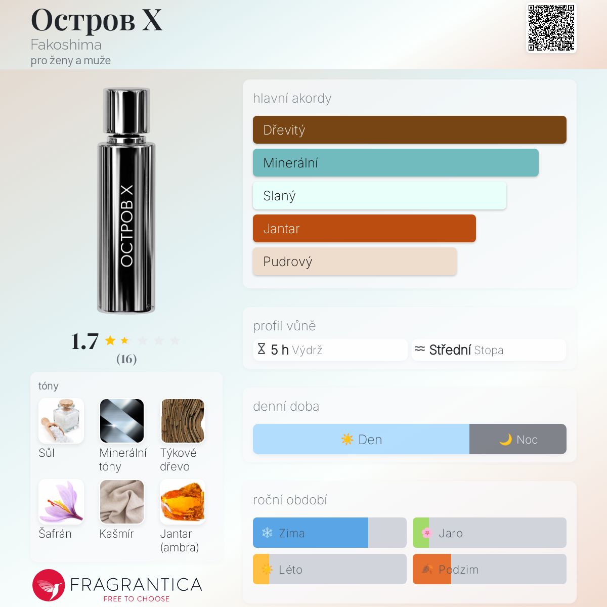 Остров Х podle Fakoshima je Orientální Woody vůně pro ženy a muže. Toto je nová vůně. Остров Х byl/a uveden/a v roce 2024. Остров Х byl/a vytvořen/a Konstantin Shilyaev a Yaroslav Simonov. Vrchní tóny jsou Mořská sůl, Šafrán, Bylinné tóny, Muškátový oříšek, Rum a Růžový pepř; střední tóny jsouMinerální tóny, Kašmír, Texaský cedr, Bílý semiš, Bílé květy, Fialka a Růže ; základní tóny jsou Týkové dřevo, Jantar (ambra), Kosatec, Fazole tonka, Bourbonská vanilka a Tabák.