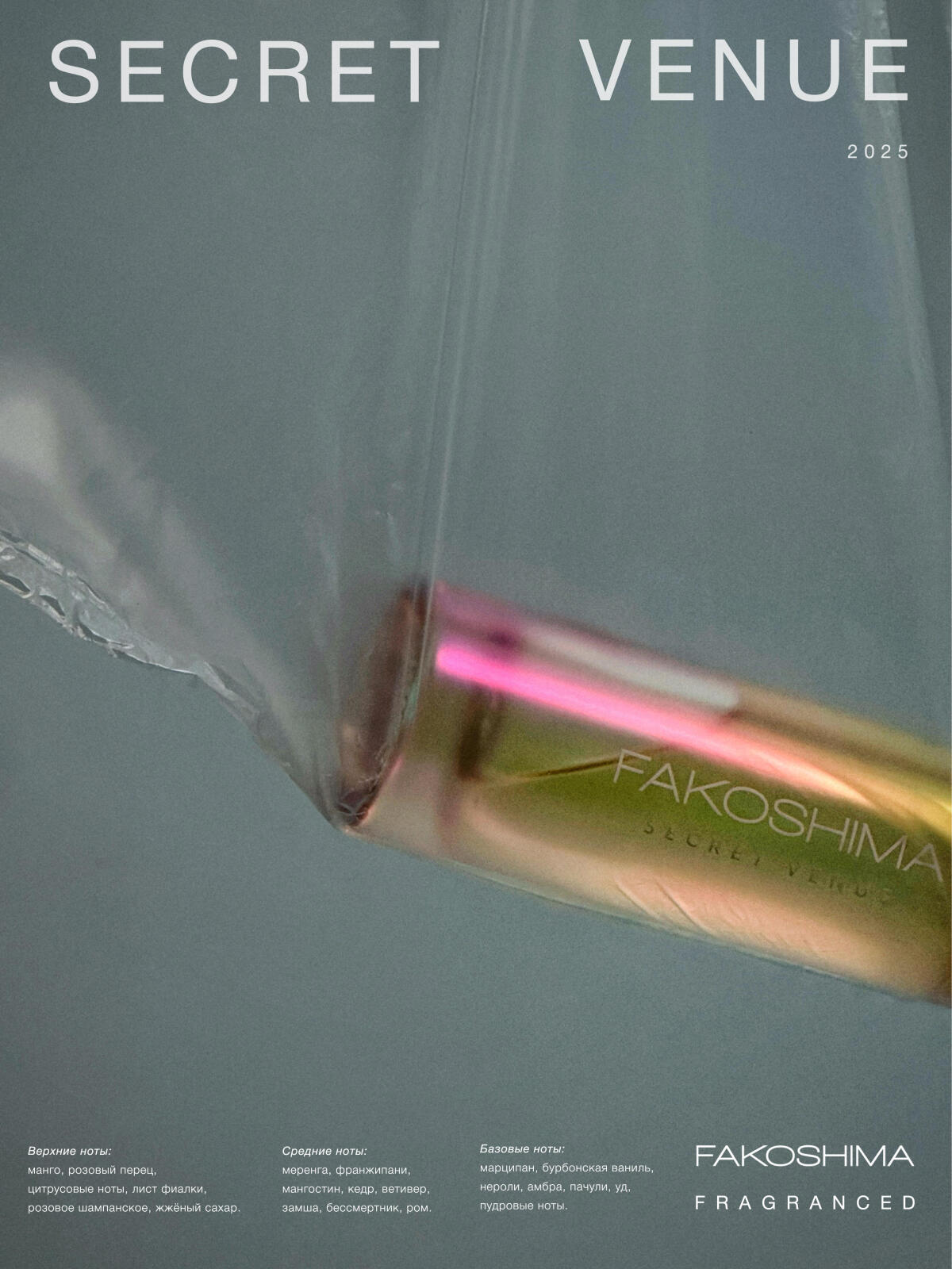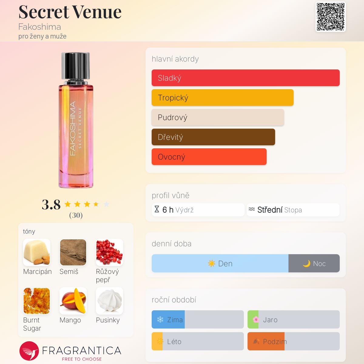 Secret Venue podle Fakoshima je vůně pro ženy a muže. Toto je nová vůně. Secret Venue byl/a uveden/a v roce 2025. "Nosem" za touto vůní je Yaroslav Simonov. Vrchní tóny jsou Spálený cukr, Růžový pepř, Mango, Šampaňské, Fialkový list a Citrusy; střední tóny jsouMangostan, Semiš, Sněhová pusinka, Rum, Plumérie, Slaměnka, Vetiver a Cedr ; základní tóny jsou Marcipán, Pudrové tóny, Pačuli, Bourbonská vanilka, Neroli, Jantar (ambra) a Agarové dřevo (oud).