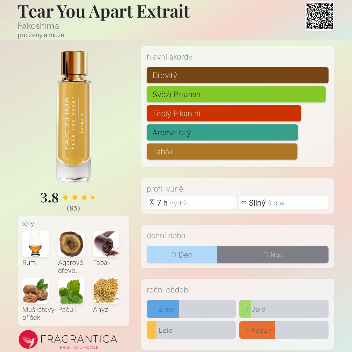 Tear You Apart Extrait podle Fakoshima je Orientální Woody vůně pro ženy a muže. Tear You Apart Extrait byl/a uveden/a v roce 2020. "Nosem" za touto vůní je Yaroslav Simonov. Vrchní tóny jsou Rum, Anýz, Šafrán a Růžový pepř; střední tóny jsouMuškátový oříšek, Jalovcové bobulky, Haitský vetiver a Semiš ; základní tóny jsou Agarové dřevo (oud), Tabák, Pačuli a Fazole tonka.