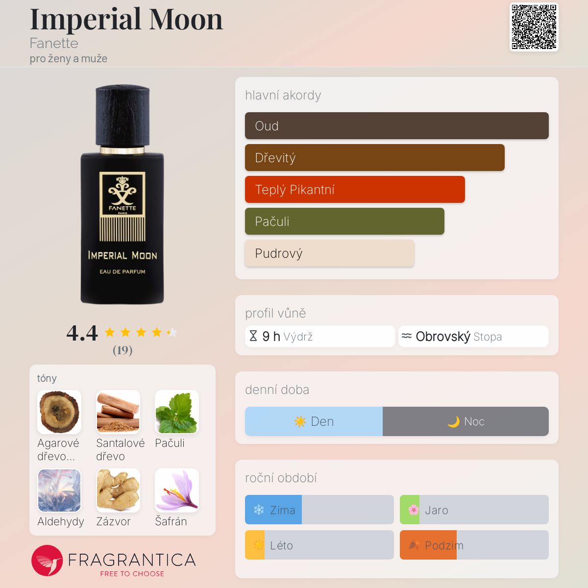 Imperial Moon podle Fanette je Woody Spicy vůně pro ženy a muže. Imperial Moon byl/a uveden/a v roce 2016. Vrchní tóny jsou Aldehydy, Zázvor a Šafrán; střední tóny jsouSantalové dřevo a Pačuli ; základní tóny jsou Agarové dřevo (oud) a Jantar (ambra).