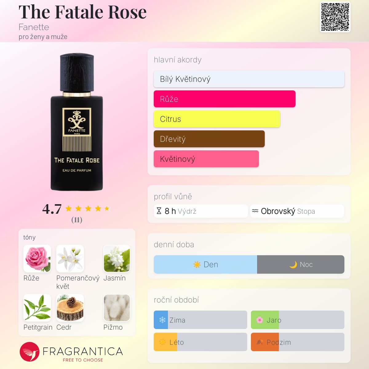 The Fatale Rose podle Fanette je Floral Woody Musk vůně pro ženy a muže. The Fatale Rose byl/a uveden/a v roce 2016. Vrchní tón je Mandarinkový list ; střední tóny jsouFrancouzská růže, Pomerančový květ a Jasmín ; základní tóny jsou Cedr a Pižmo.