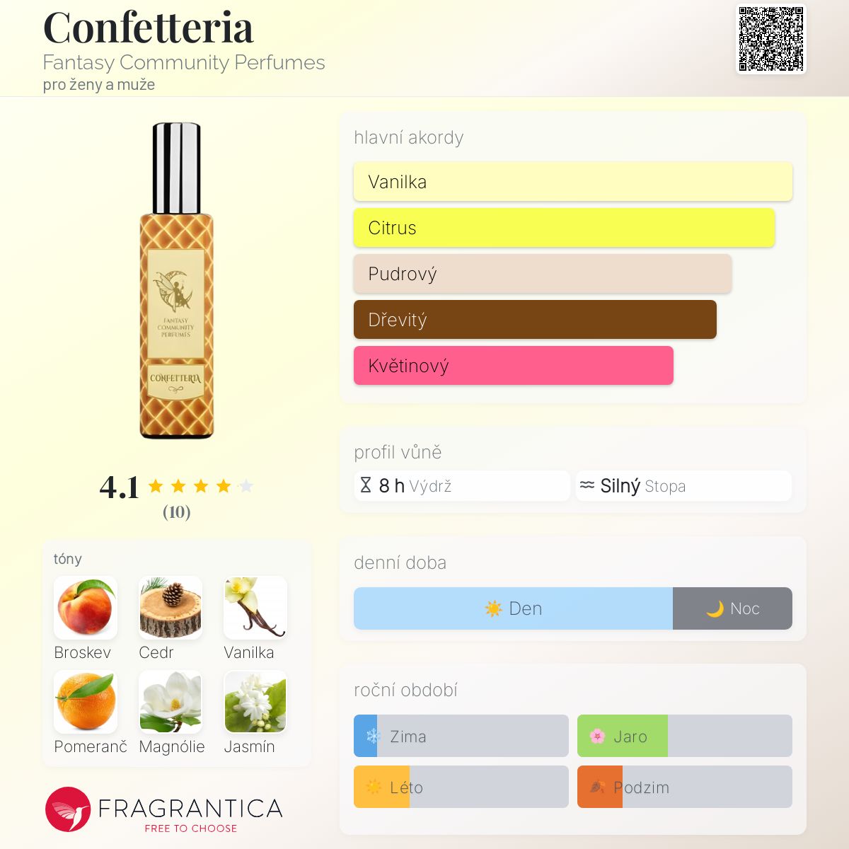 Confetteria podle Fantasy Community Perfumes je vůně pro ženy a muže. Confetteria byl/a uveden/a v roce 2022. Vrchní tóny jsou Pomeranč, Bergamot, Citrón a Zelené tóny; střední tóny jsouBroskev, Cedr, Magnólie, Jasmín a Pačuli ; základní tóny jsou Vanilka, Fazole tonka, Pižmo, Otočník a Hruška.