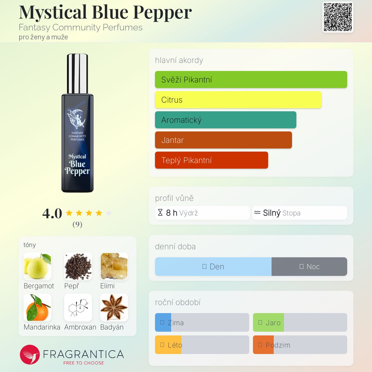 Mystical Blue Pepper podle Fantasy Community Perfumes je vůně pro ženy a muže. Mystical Blue Pepper byl/a uveden/a v roce 2022. Vrchní tóny jsou Bergamot, Elimi a Mandarinka; střední tóny jsouPepř, Badyán, Levandule, Muškátový oříšek a Santalové dřevo ; základní tóny jsou Ambroxan, Fazole tonka, Olibanum a Vanilka.