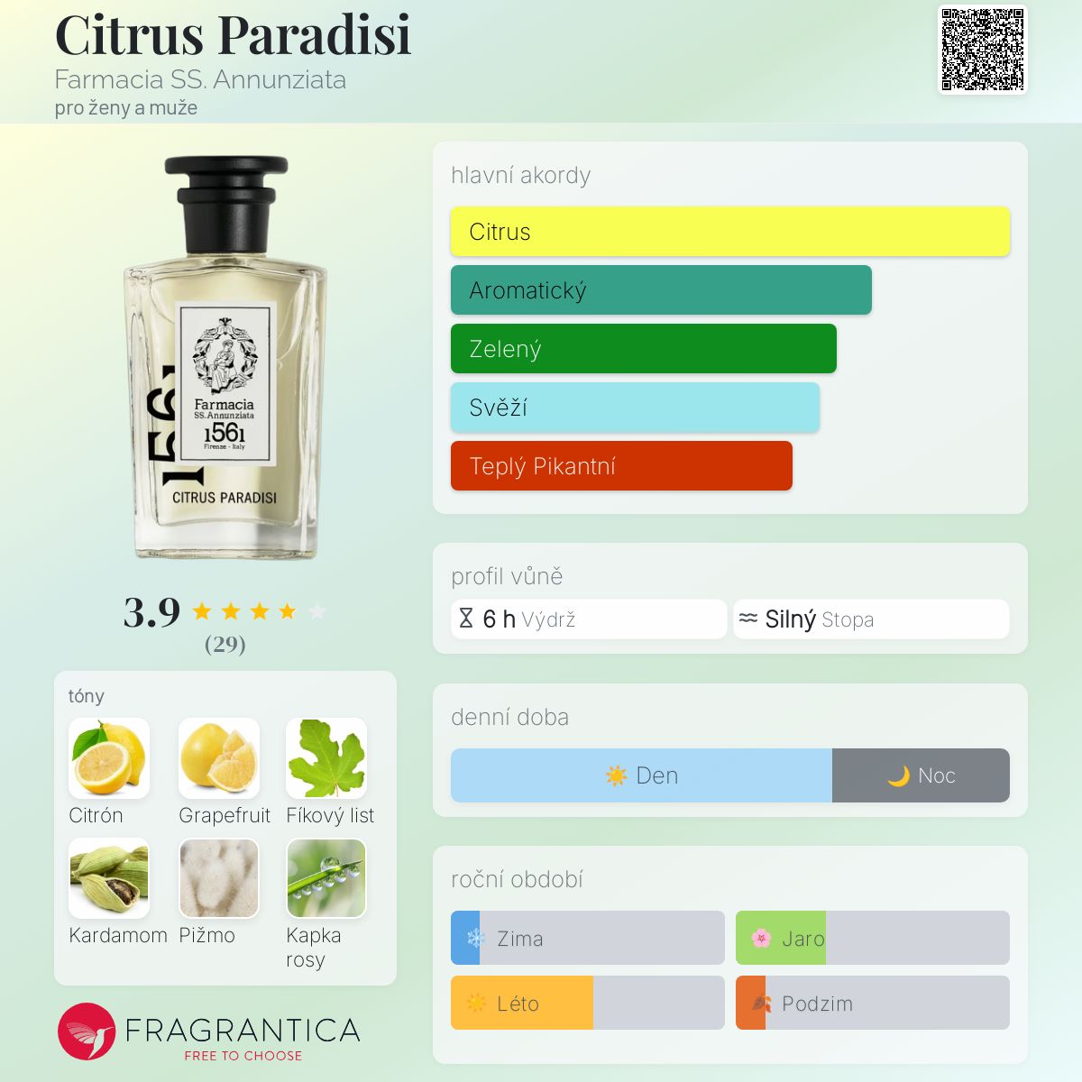 Citrus Paradisi podle Farmacia SS. Annunziata je Citrus vůně pro ženy a muže. Citrus Paradisi byl/a uveden/a v roce 2023. Vrchní tóny jsou Citrón a Růžový grapefruit; střední tóny jsouFíkový list, Kardamom, Magnólie a Černý rybíz ; základní tóny jsou Pižmo, Kapka rosy a Cedr.