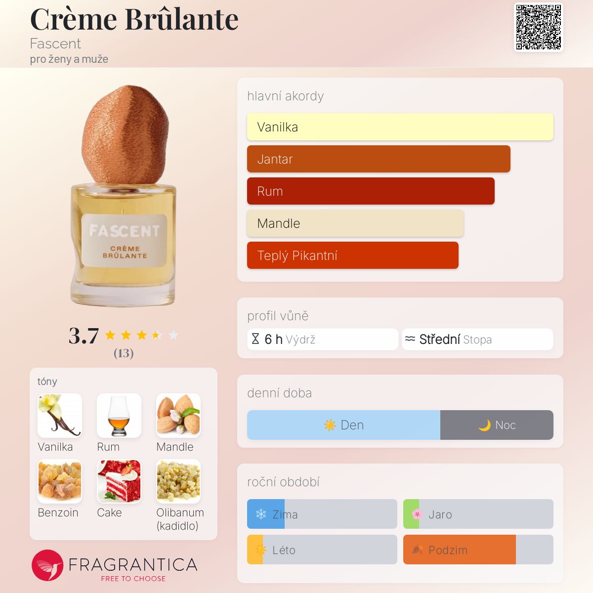 Crème Brûlante podle Fascent je Orientální Vanilla vůně pro ženy a muže. Toto je nová vůně. Crème Brûlante byl/a uveden/a v roce 2025. Vrchní tóny jsou Vanilka a Dort; střední tóny jsouRum a Mandle ; základní tóny jsou Benzoin a Kadidlo.