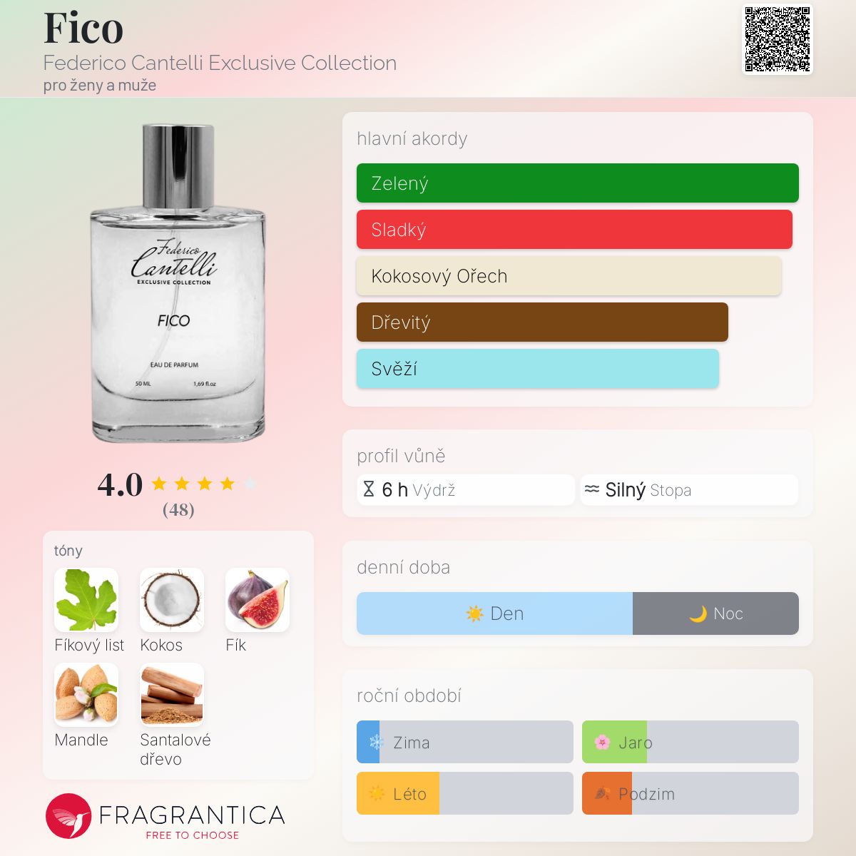 Fico podle Federico Cantelli Exclusive Collection je vůně pro ženy a muže. Fico byl/a uveden/a v roce 2021. "Nosem" za touto vůní je Federico Cantelli. Vrchní tón je Fíkový list ; střední tóny jsouMandlové mléko a Santalové dřevo ; základní tóny jsou Kokosové mléko a Fík.