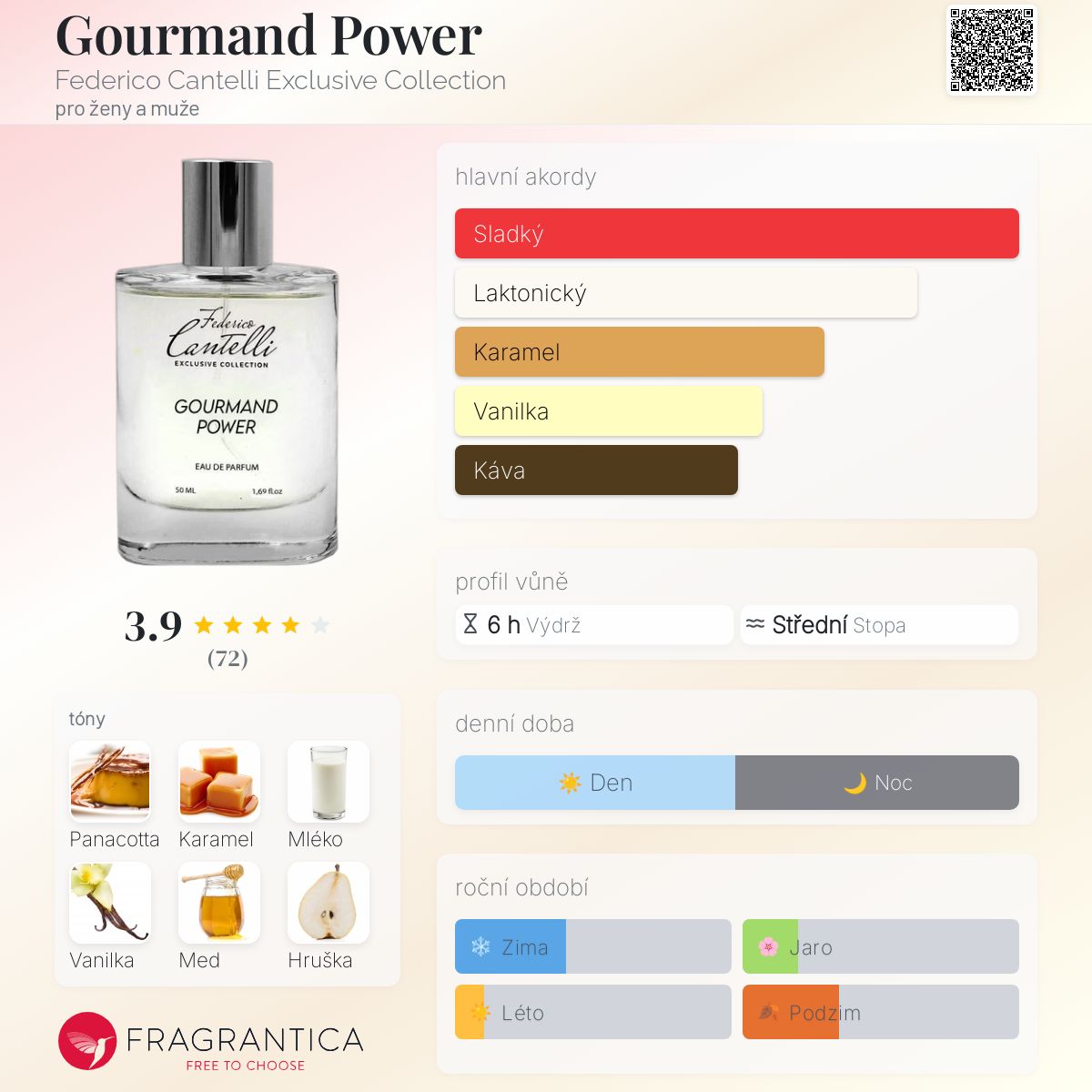 Gourmand Power podle Federico Cantelli Exclusive Collection je vůně pro ženy a muže. Toto je nová vůně. Gourmand Power byl/a uveden/a v roce 2024. "Nosem" za touto vůní je Federico Cantelli. Vrchní tóny jsou Panacotta, Vanilka a Hruška; střední tóny jsouKaramel a Mléko ; základní tóny jsou Mléko, Vanilka a Med.