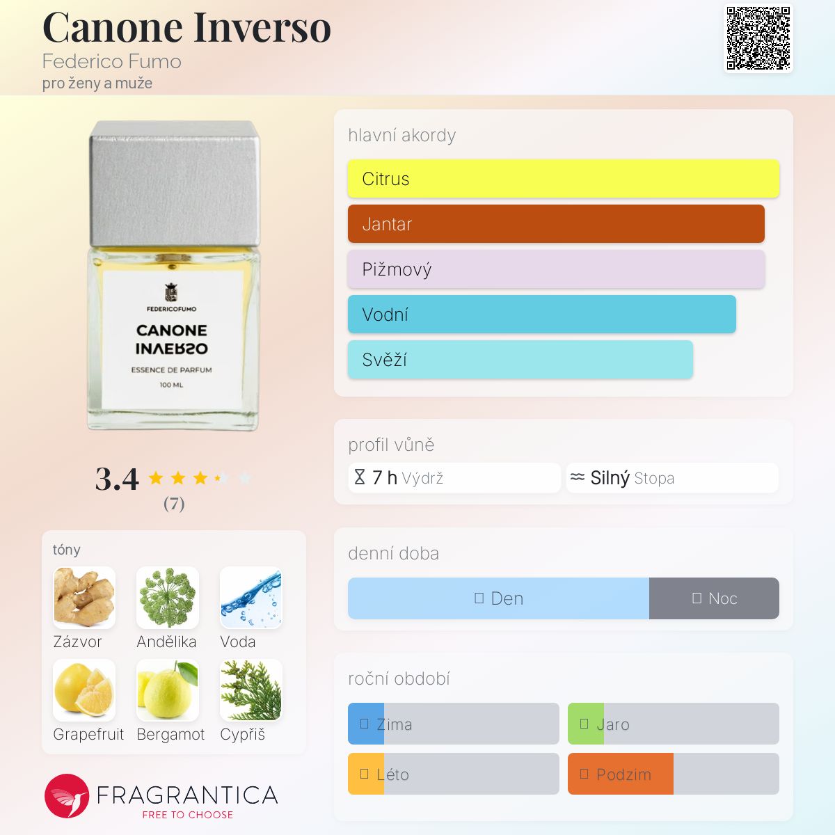 Canone Inverso podle Federico Fumo je vůně pro ženy a muže. Canone Inverso byl/a uveden/a v roce 2021. "Nosem" za touto vůní je Federico Fumo. Vrchní tóny jsou Zázvor, Grapefruit a Bergamot; střední tóny jsouCypřiš a Tabák ; základní tóny jsou Andělika, Vodnaté tóny, Labdanum, Zemité tóny, Vanilka, Agarové dřevo (oud) a Pačuli.