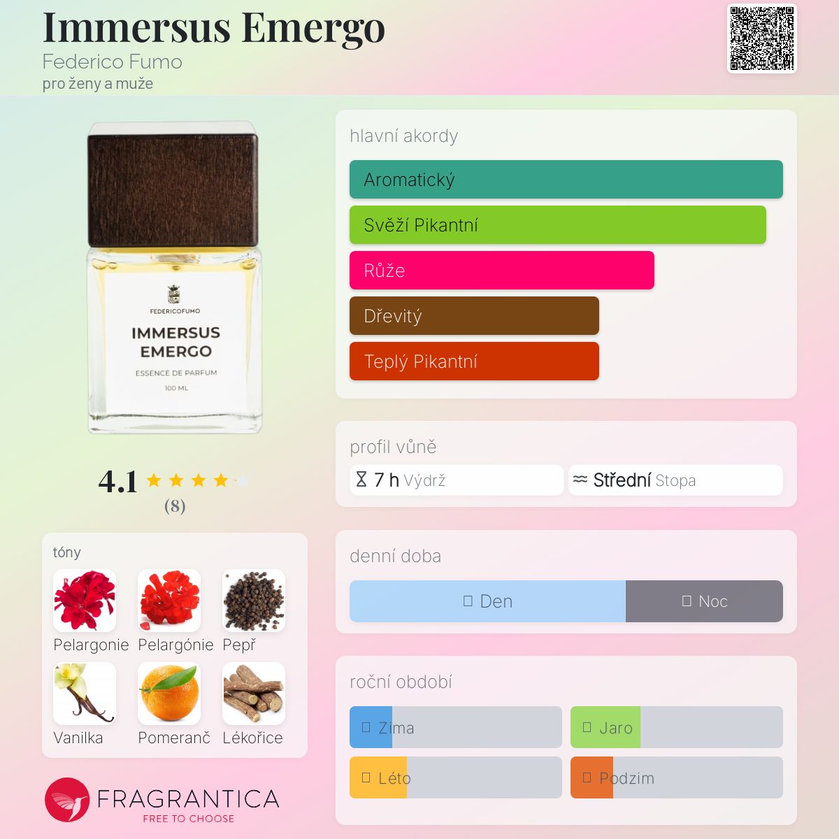 Immersus Emergo podle Federico Fumo je vůně pro ženy a muže. Immersus Emergo byl/a uveden/a v roce 2021. "Nosem" za touto vůní je Federico Fumo. Vrchní tóny jsou Pomerančová slupka a Lékořice; střední tóny jsouPelargonie, Pelargónie, Černý pepř a Koriandr ; základní tóny jsou Vanilka, Cedr, Pačuli, Benzoin, Kůže a Fazole tonka.