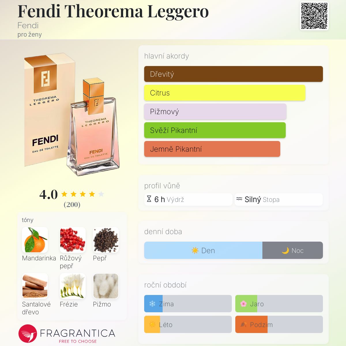 Fendi Theorema Leggero podle Fendi je Orientální Spicy vůně pro ženy. Fendi Theorema Leggero byl/a uveden/a v roce 2002. Vrchní tóny jsou Mandarinka a Pepř; střední tóny jsouRůžový pepř, Frézie a Konvalinka ; základní tóny jsou Santalové dřevo, Pižmo a Cedr.