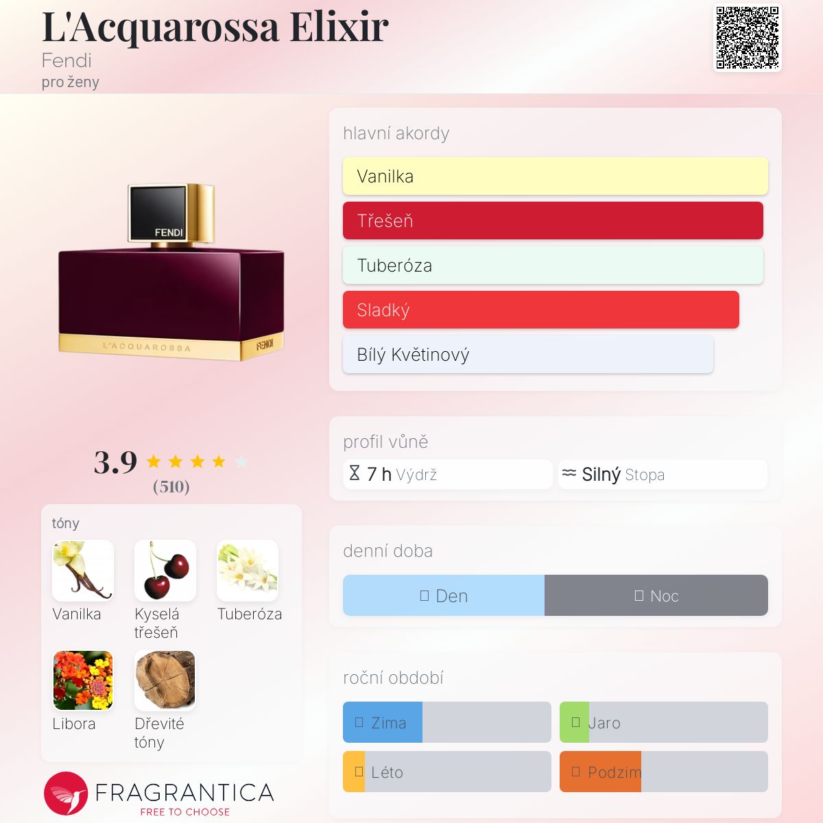 L'Acquarossa Elixir podle Fendi je Orientální Floral vůně pro ženy. L'Acquarossa Elixir byl/a uveden/a v roce 2015. Vrchní tón je Kyselá třešeň ; střední tóny jsouTuberóza a Libora ; základní tóny jsou Vanilka a Dřevité tóny.