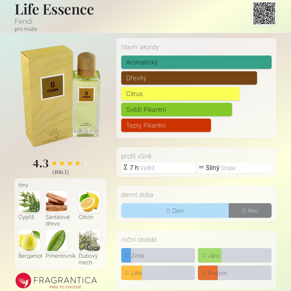 Life Essence podle Fendi je Orientální Spicy vůně pro muže. Life Essence byl/a uveden/a v roce 1996. Vrchní tóny jsou Citrón, Bergamot, Koriandr, Kardamom a Mandarinka; střední tóny jsouCypřiš, Pimentovník, Pelargónie a Jasmín ; základní tóny jsou Santalové dřevo, Dubový mech a Cedr.