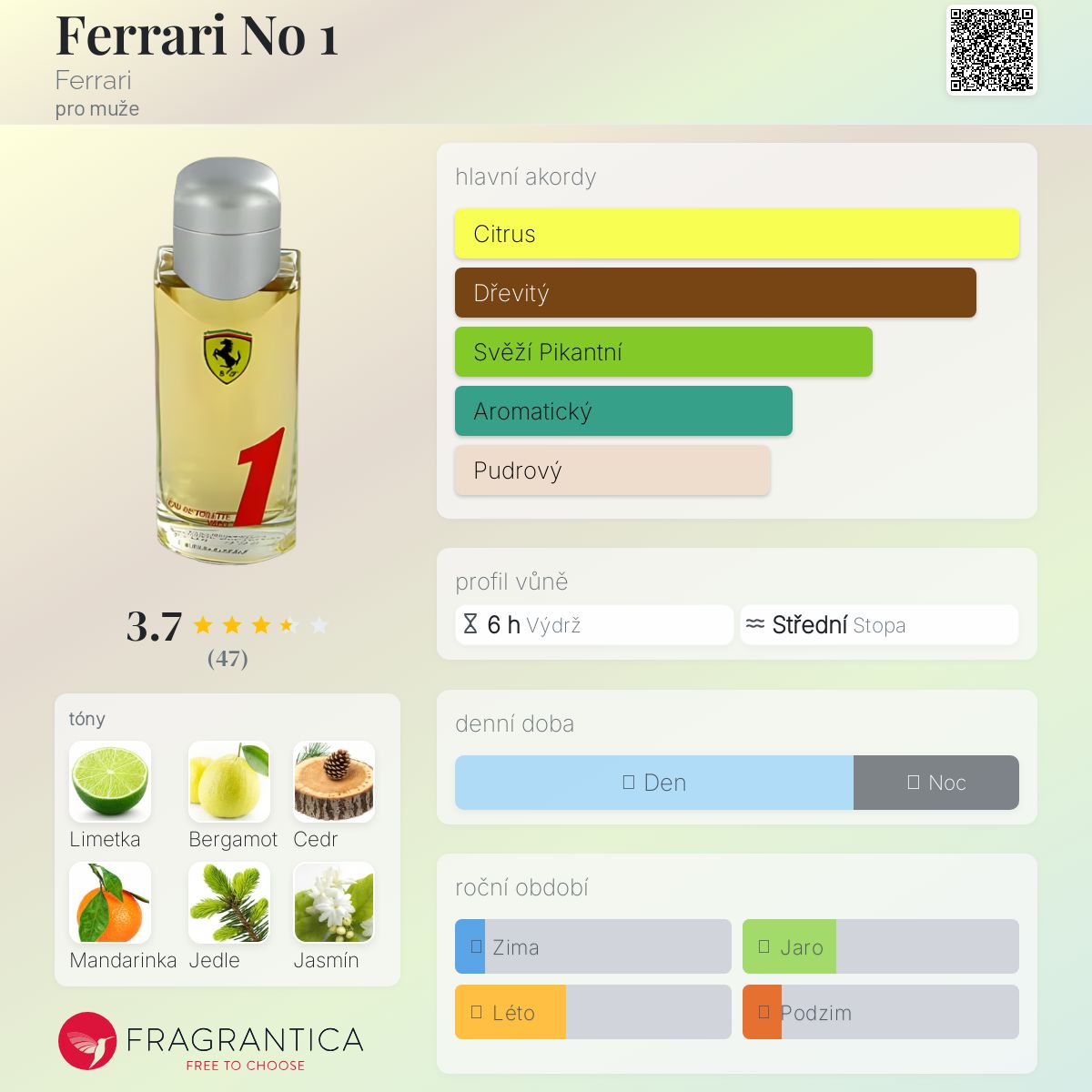 Ferrari No 1 podle Ferrari je Woody vůně pro muže. Ferrari No 1 byl/a uveden/a v roce 2001. Vrchní tóny jsou Limetka, Bergamot, Mandarinka a Jedlová pryskyřice; střední tóny jsouJasmín a Muškátový oříšek ; základní tóny jsou Cedr, Santalové dřevo, Jantar (ambra) a Dubový mech.