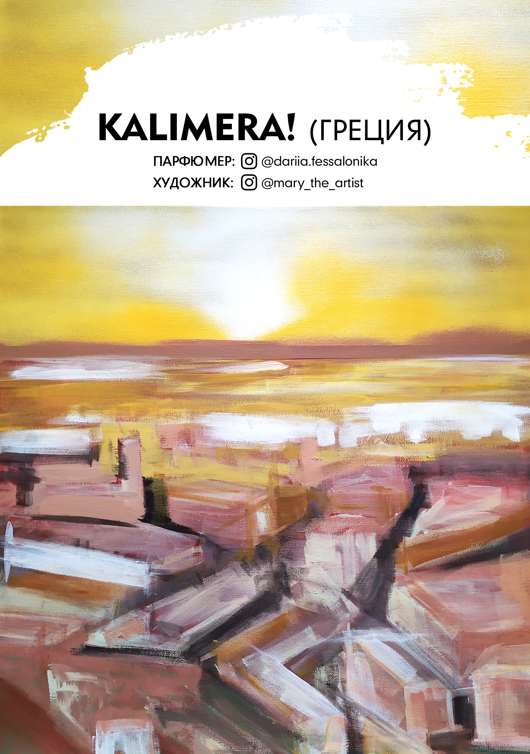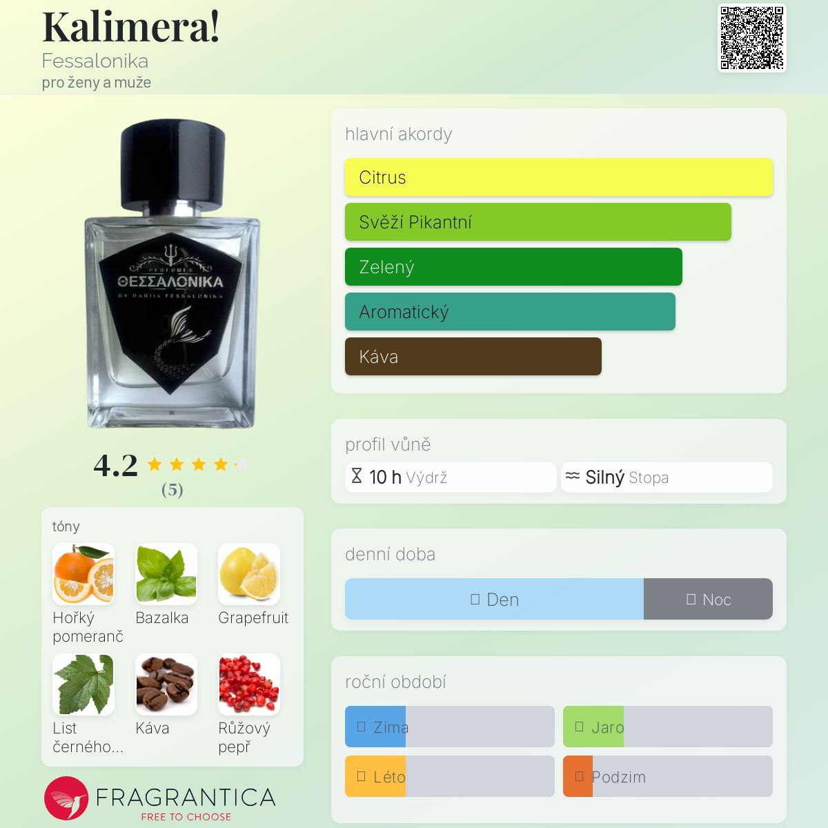 Kalimera! podle Fessalonika je Woody vůně pro ženy a muže. Kalimera! byl/a uveden/a v roce 2019. "Nosem" za touto vůní je Dariia Fessalonika. Vrchní tóny jsou Sicilský hořký pomeranč, Bazalka, Růžový grapefruit a Rebarbora; střední tóny jsouList černého rybízu, Káva, Růžový pepř a Jasmín ; základní tóny jsou Jantar (ambra), Pižmo, Fazole tonka a Agarové dřevo (oud).