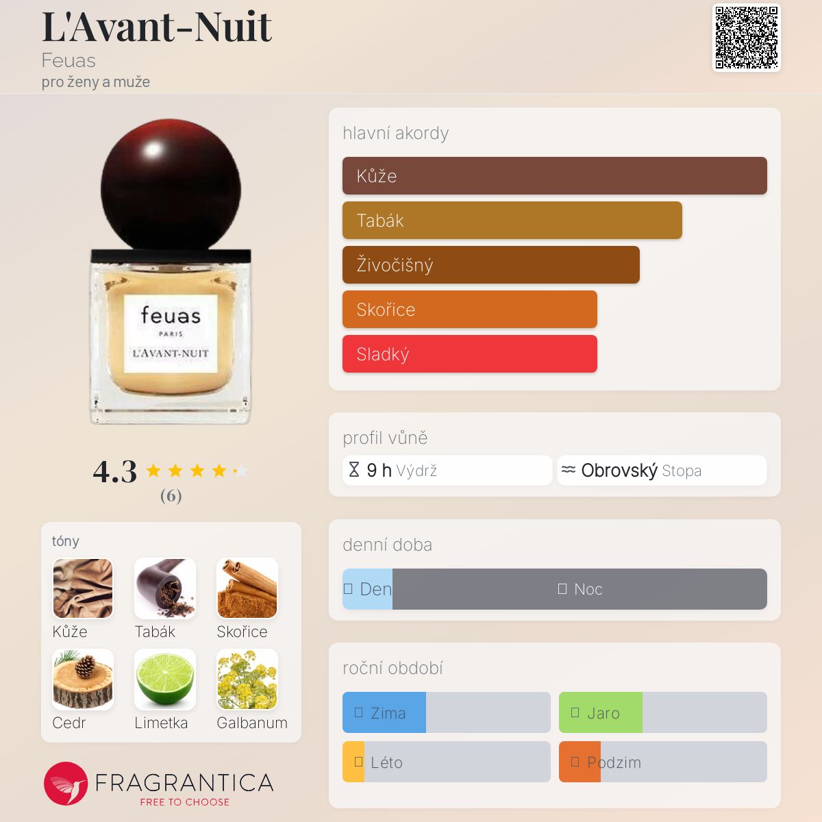 L'Avant-Nuit podle Feuas je Woody vůně pro ženy a muže. Toto je nová vůně. L'Avant-Nuit byl/a uveden/a v roce 2025. "Nosem" za touto vůní je Yusuke Masuda. Vrchní tóny jsou Limetka a Galbanum; střední tóny jsouTabák a Skořice ; základní tóny jsou Kůže a Cedr.