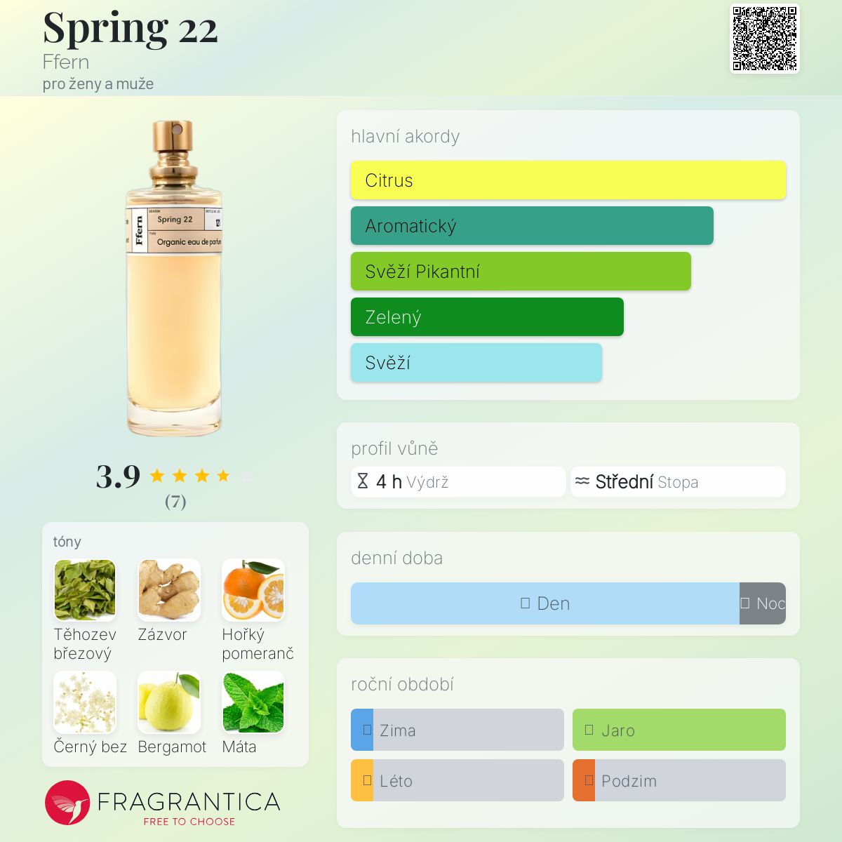Spring 22 podle Ffern je Aromatic vůně pro ženy a muže. Spring 22 byl/a uveden/a v roce 2022. "Nosem" za touto vůní je Elodie Durande. Vrchní tóny jsou Těhozev březový, Nigerijský zázvor, Hořký pomeranč, Pikantní máta, Zelená mandarinka, Limetková kůra, Růžový pepř a Paraguajský petitgrain; střední tóny jsouKalábrijský bergamot, Bazalka, Jasmín Sambac a Tuniské neroli ; základní tóny jsou Černý bez, Virginský cedr, Haitský vetiver a Tuniský pomerančový květ.