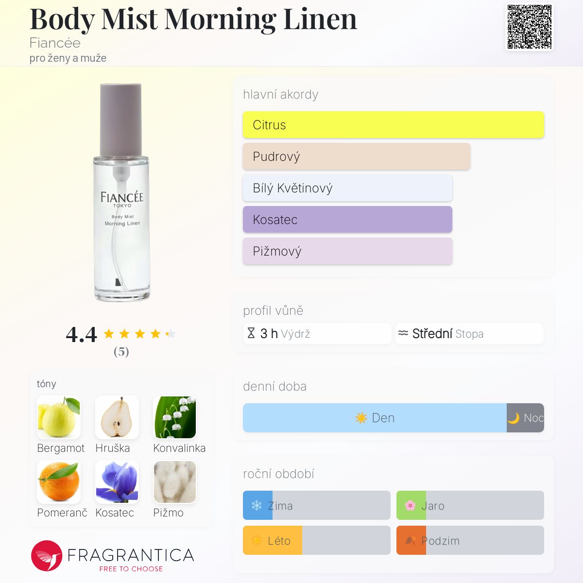 Body Mist Morning Linen podle Fiancée je vůně pro ženy a muže. Vrchní tóny jsou Bergamot a Hruška; střední tóny jsouKonvalinka, Pomeranč a Kosatec ; základní tón je Bílé pižmo.