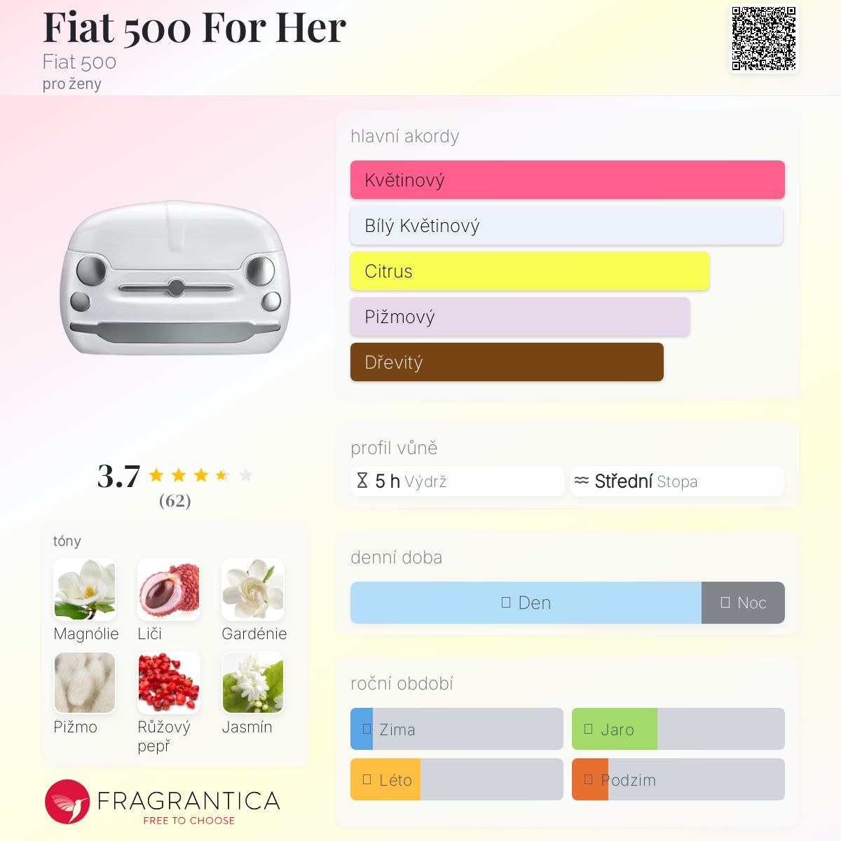 Fiat 500 For Her podle Fiat 500 je Floral Woody Musk vůně pro ženy. Fiat 500 For Her byl/a uveden/a v roce 2018. "Nosem" za touto vůní je Fanny Bal. Vrchní tóny jsou Liči, Růžový pepř a Mandarinka; střední tóny jsouMagnólie, Gardénie a Jasmín ; základní tóny jsou Bílé pižmo, Virginský cedr a Santalové dřevo.