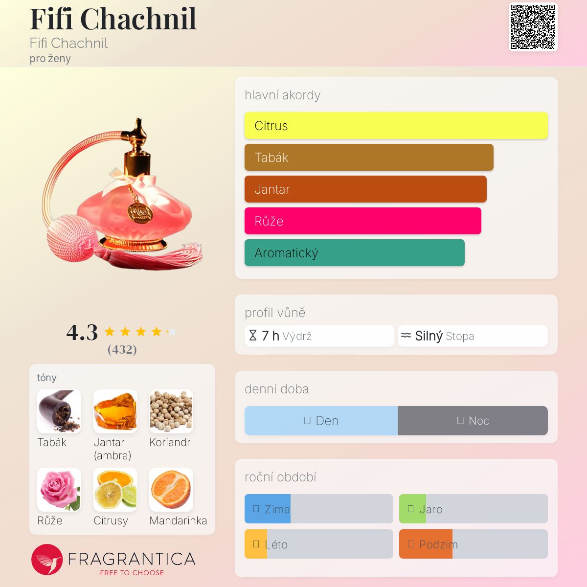Fifi Chachnil podle Fifi Chachnil je Orientální Floral vůně pro ženy. Vrchní tóny jsou Koriandr, Citrusy a Mandarinka; střední tóny jsouRůže a Konvalinka ; základní tóny jsou Tabák a Jantar (ambra).