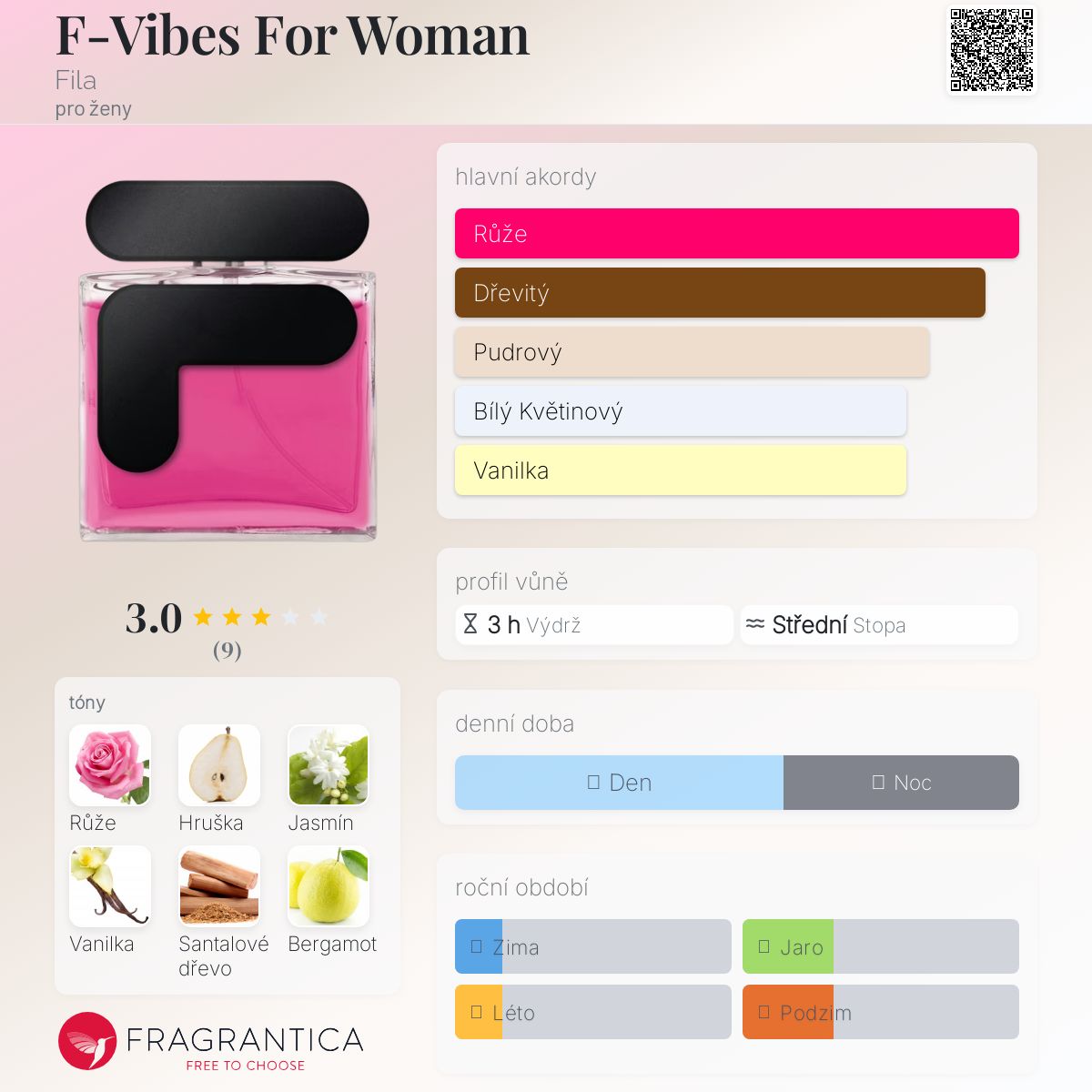 F-Vibes For Woman podle Fila je vůně pro ženy. Toto je nová vůně. F-Vibes For Woman byl/a uveden/a v roce 2022. Vrchní tóny jsou Hruška a Bergamot; střední tóny jsouRůže de Mai a Jasmín ; základní tóny jsou Vanilka, Santalové dřevo, Pižmo a Pačuli.