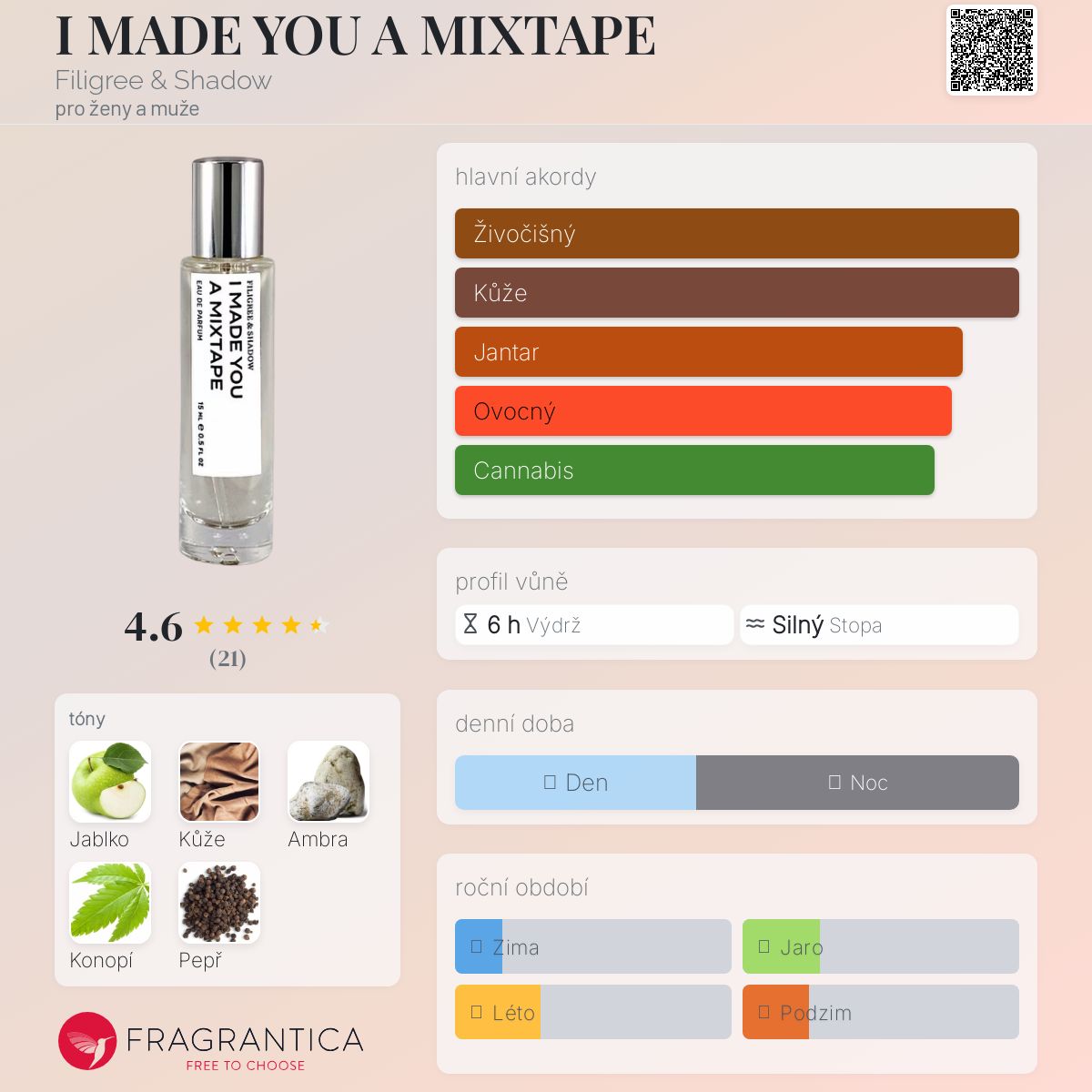 I MADE YOU A MIXTAPE podle Filigree & Shadow je vůně pro ženy a muže. I MADE YOU A MIXTAPE byl/a uveden/a v roce 2018. "Nosem" za touto vůní je James Elliott. Vrchní tón je Jablko ; střední tóny jsouKonopí a Černý pepř ; základní tóny jsou Kůže a Ambra.