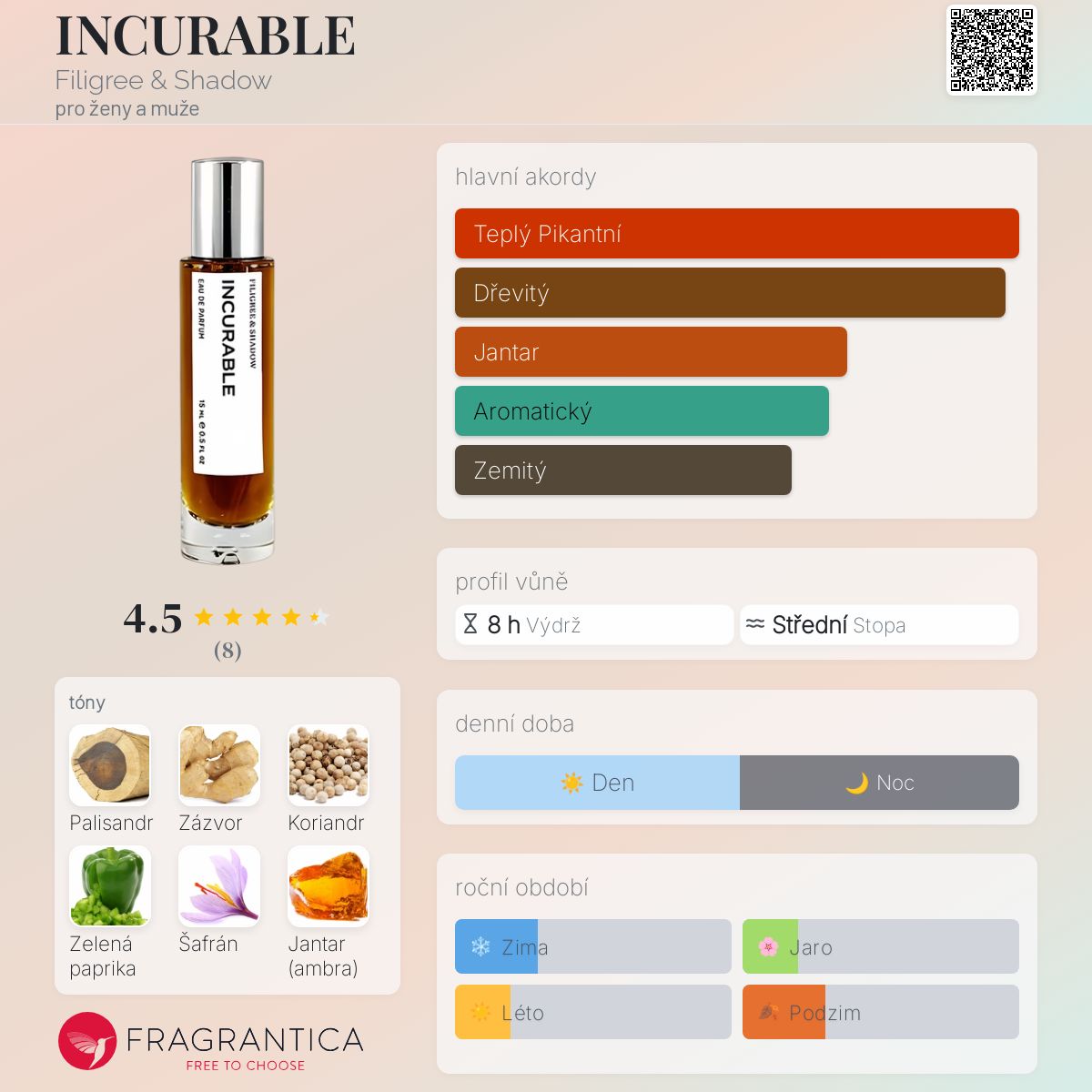 INCURABLE podle Filigree & Shadow je vůně pro ženy a muže. INCURABLE byl/a uveden/a v roce 2015. "Nosem" za touto vůní je James Elliott. Vrchní tón je Zázvor ; střední tóny jsouPalisandr, Koriandr, Zelená paprika a Šafrán ; základní tóny jsou Jantar (ambra), Cedr, Hřebíček, Dubový mech, Pačuli a Fazole tonka.