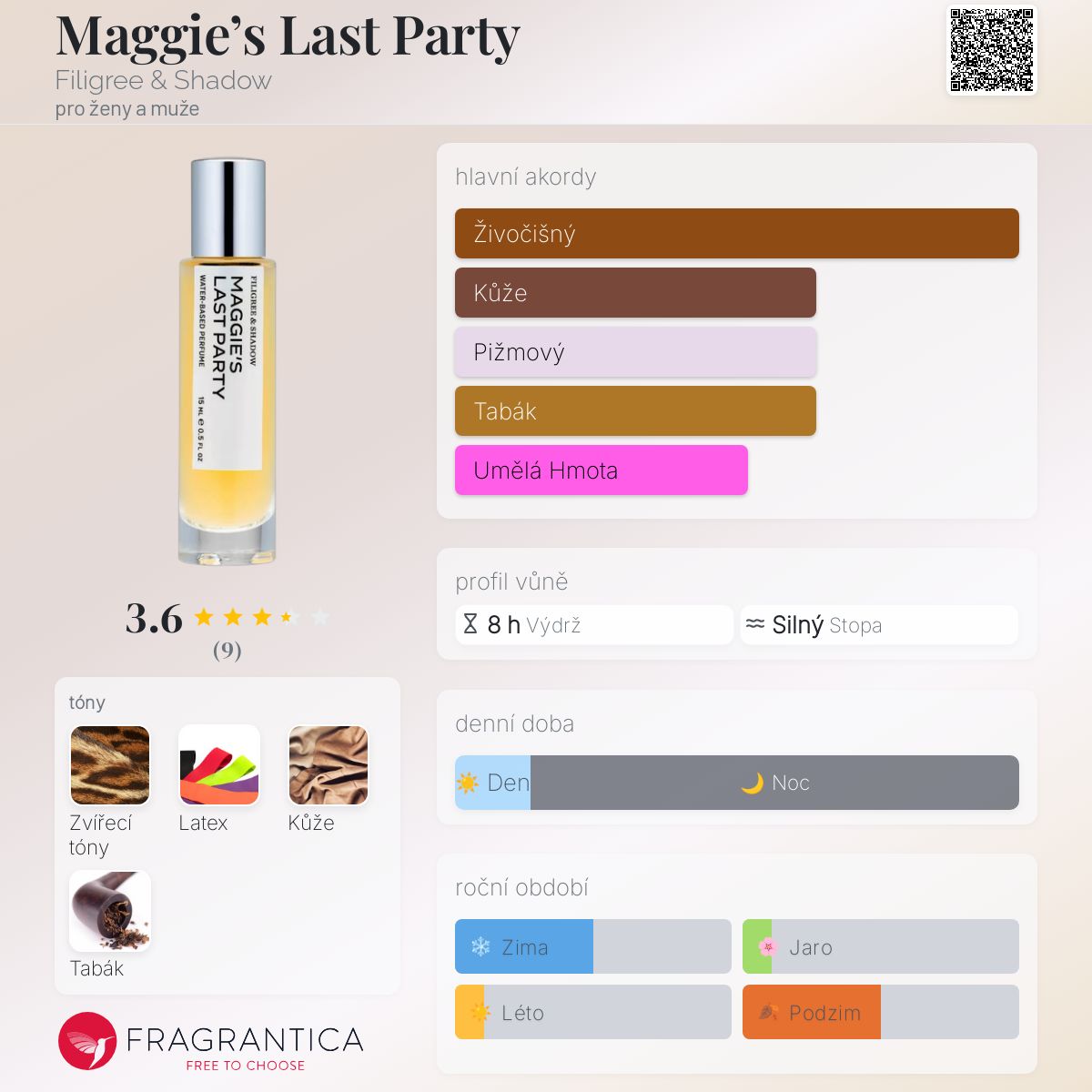 Maggie’s Last Party podle Filigree & Shadow je vůně pro ženy a muže. Toto je nová vůně. Maggie’s Last Party byl/a uveden/a v roce 2024. "Nosem" za touto vůní je James Elliott.