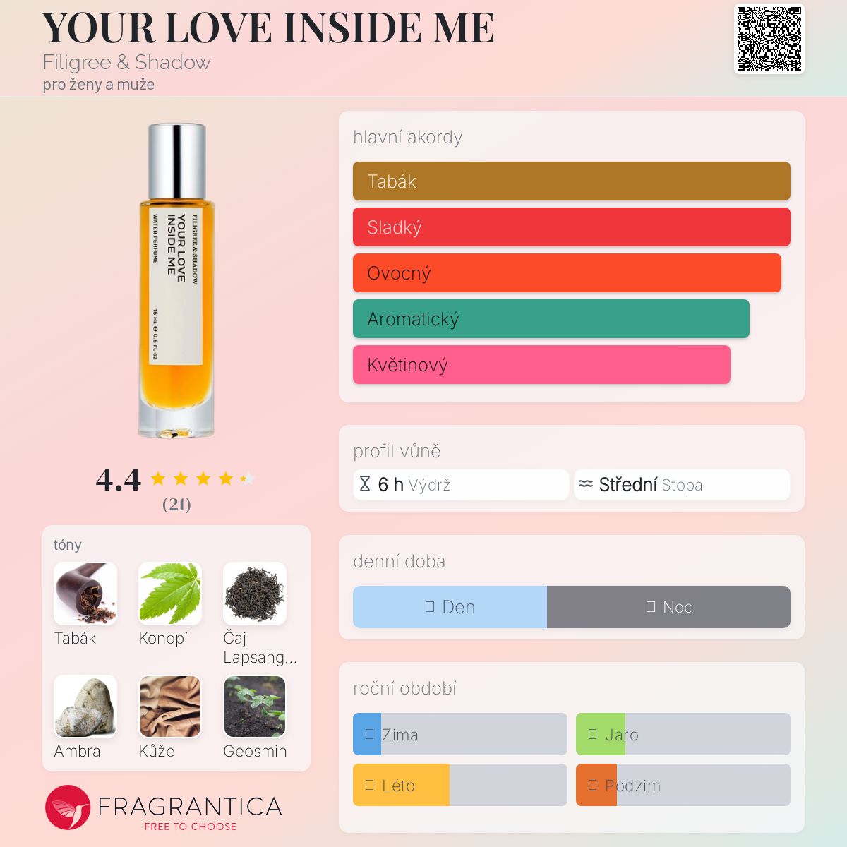 YOUR LOVE INSIDE ME podle Filigree & Shadow je Floral Woody Musk vůně pro ženy a muže. YOUR LOVE INSIDE ME byl/a uveden/a v roce 2021. "Nosem" za touto vůní je James Elliott. Vrchní tóny jsou Geosmin, Hyacint a Magnólie; střední tóny jsouKonopí, Čaj Lapsang souchong, Fík, Hruška a Švestka ; základní tóny jsou Tabák, Ambra, Kůže, Mořské tóny a Opalovací krém.