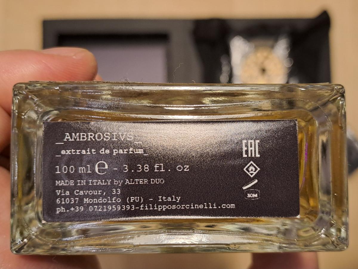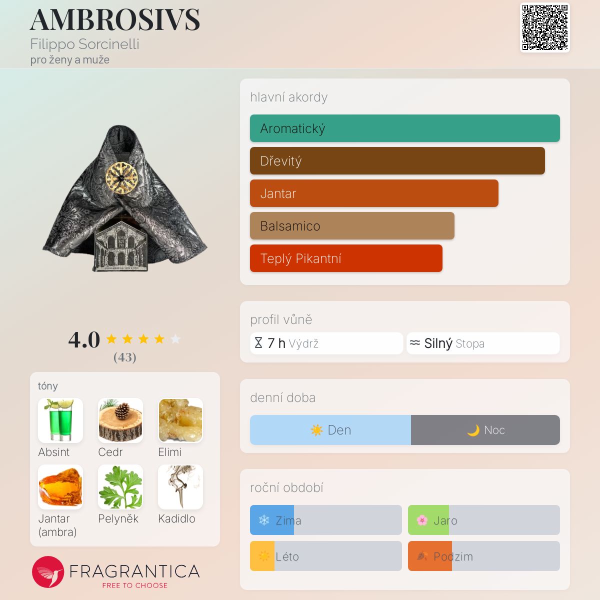AMBROSIVS podle Filippo Sorcinelli je Woody Spicy vůně pro ženy a muže. AMBROSIVS byl/a uveden/a v roce 2023. "Nosem" za touto vůní je Filippo Sorcinelli. Vrchní tóny jsou Absint, Pryskyřice elimi, Pelyněk, Kadidlo, Jalovec, Rozmarýn, Grapefruit a Citrón; střední tóny jsouCedr, Bříza, Brambořík a Hřebíček ; základní tóny jsou Jantar (ambra), Pačuli, Santalové dřevo, Vanilka, Fazole tonka, Labdanum a Vetiver.