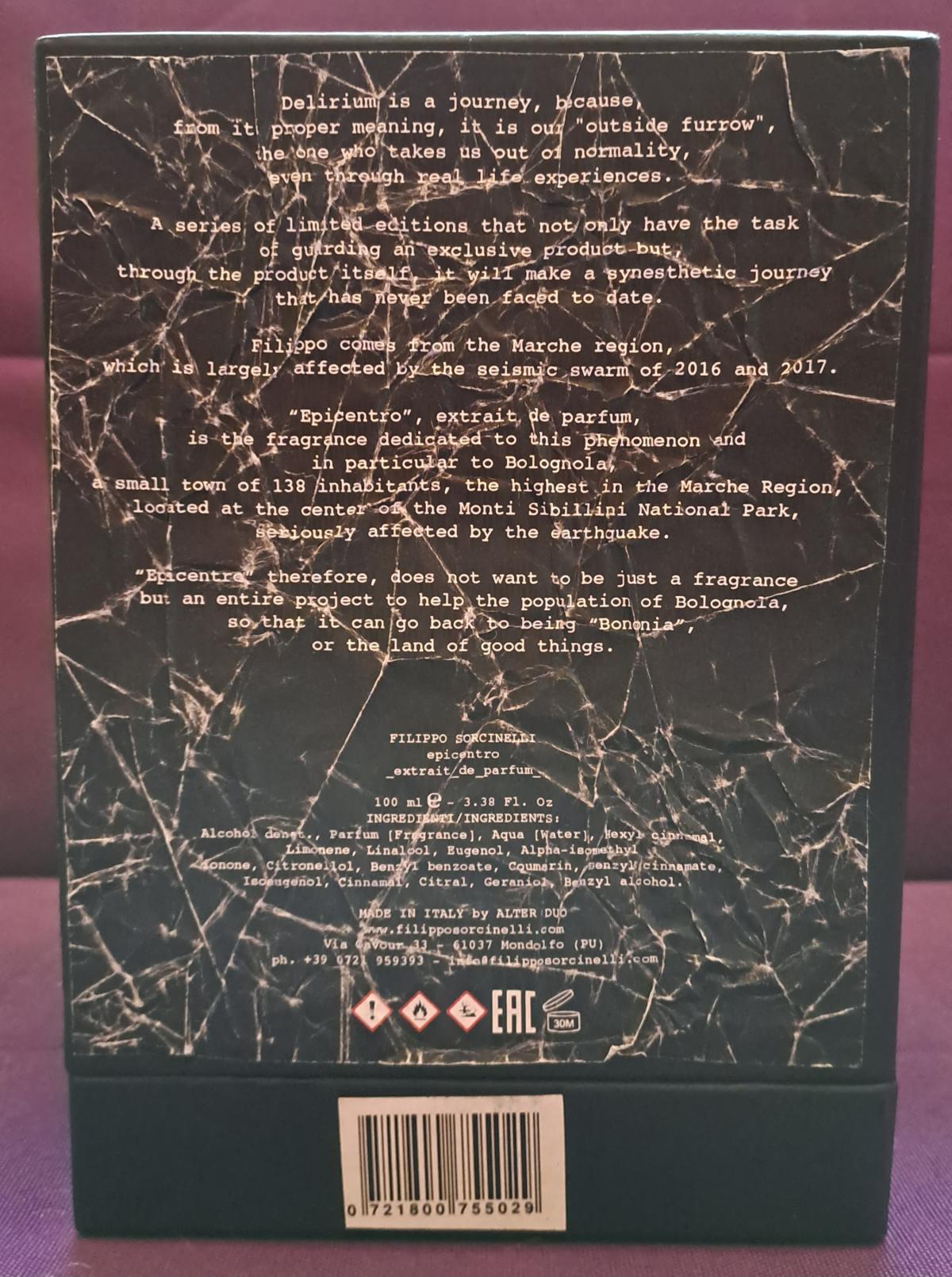 Epicentro podle Filippo Sorcinelli je Woody Aromatic vůně pro ženy a muže. Epicentro byl/a uveden/a v roce 2019. Vrchní tóny jsou Bergamot a Virginský cedr; střední tóny jsouPuškvorec obecný, Maté a Ambrette (přírodní pižmo) ; základní tóny jsou Andělika, Jedle balzámová, Vetiver, Kmín, Guajakové dřevo, Benzoin a Jantar (ambra).