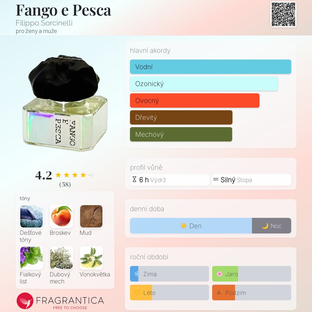 Fango e Pesca podle Filippo Sorcinelli je Chypre Fruity vůně pro ženy a muže. Toto je nová vůně. Fango e Pesca byl/a uveden/a v roce 2025. Vrchní tóny jsou Dešťové tóny, Broskev, Fialkové listy a Koriandr; střední tóny jsouBahno, Vonokvětka, Jasmín a Gurjanský balzám ; základní tóny jsou Dubový mech, Pačuli, Pižmo a Tabák.